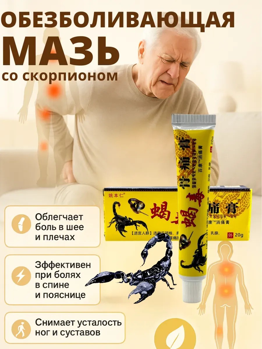 Уникальная формула на основе пяти активных компонентов (яд скорпиона, змеиный яд, пчелиный яд, экстракт ящерицы и женьшень) глубоко проникает в ткани, устраняет мышечное напряжение и возвращает подвижность суставов.