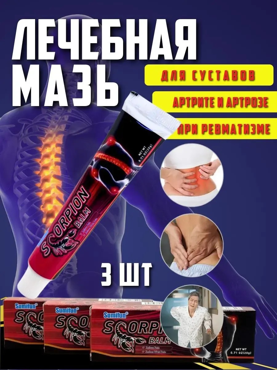 Обезболивающая разогревающая мазь с ядом скорпиона — эффективное средство для снятия боли в суставах, мышцах и спине. Мазь помогает при артрите, артрозе, остеохондрозе, ревматизме, растяжениях, ушибах, болях в коленях, пояснице, шее и плечевом поясе.
