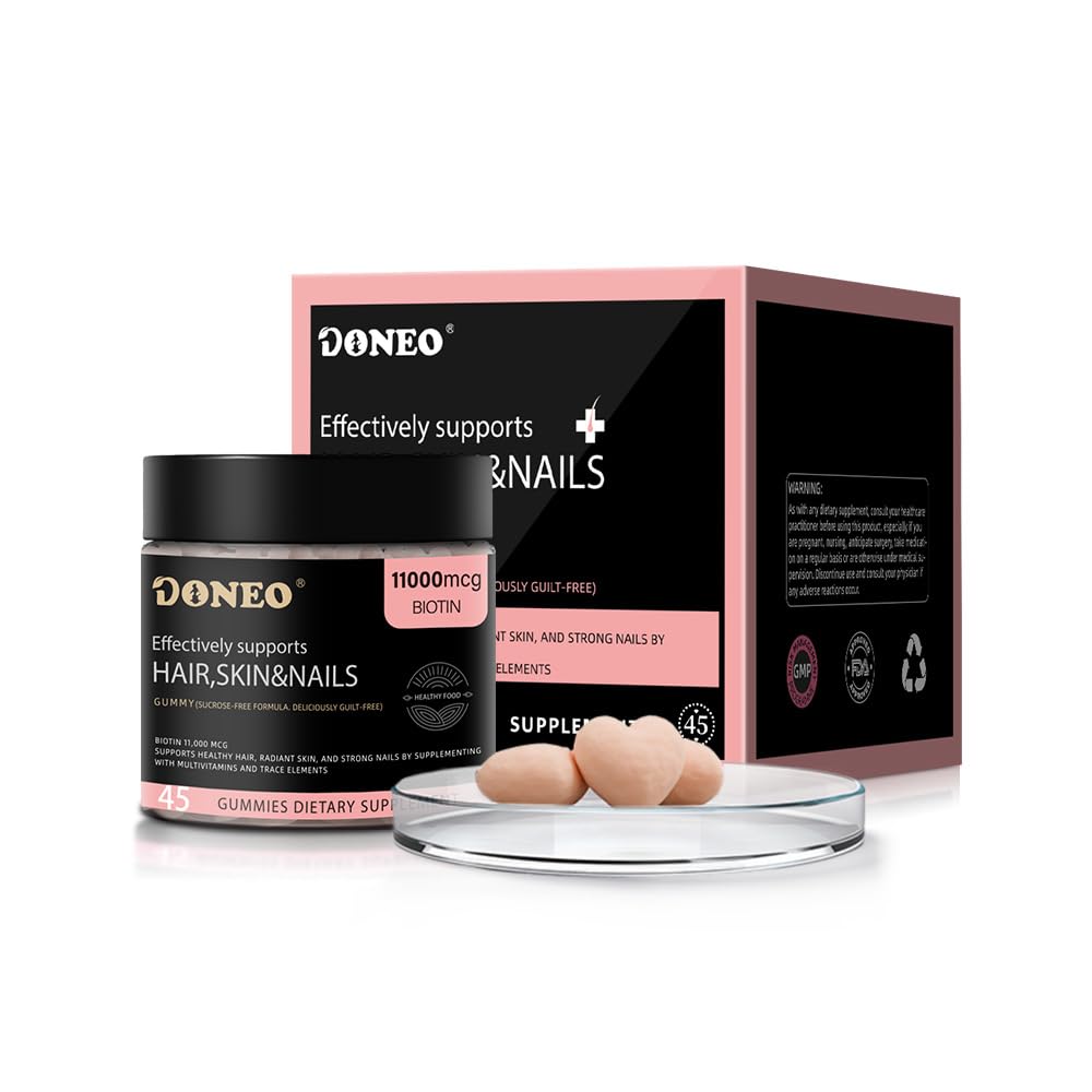 Made in the USA! Clinically Tested - Doneo always prioritizes quality. That's why our biotin vitamins are all made in the USA with only safe and tested ingredients that meet the strictest standards. After 28 days of clinical testing, it reduces hair loss and revitalizes hair follicles. All-in-One Beauty Support – Combines 23 nutrients (including PPQ and collagen) in a daily dose. Targets hair growth, skin hydration, and nail strength while supporting energy metabolism and overall health. Quality and safety you can trust - rigorously tested for purity and potency. Free of gelatin, GMOs and synthetic additives. Comes with a 30-day money-back guarantee to give you confidence in every bottle. Science-Backed Formula – Contains a powerful blend of biotin (B7), hyaluronic acid, keratin, and antioxidants to combat oxidative stress, enhance elasticity, and promote a youthful glow. Vegan, non-GMO, and gluten-free. Delicious and sugar-free gummies - no more hard-to-swallow pills! Enjoy natural vegan gummies with sugar-free ingredients and don't worry about being difficult to manage your body after taking it for a long time. Perfect for beauty support on the go, with no artificial flavors or preservatives. Boost Hair, Skin Nail Health – Packed with 11,000 mcg Biotin, collagen, and essential vitamins (A, C, E, B-complex) to nourish from within. Supports stronger nails, thicker hair, and radiant skin while promoting natural collagen production.