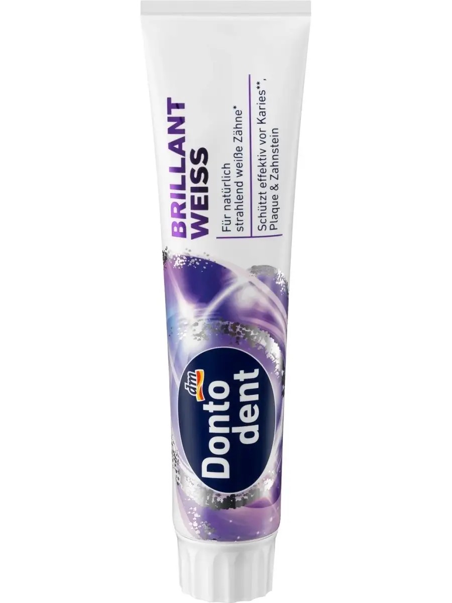 For naturally shining white teeth*Effectively protects against cavities**, plaque, and tartarGently removes discolorationsPigment-free colorFor healthy, naturally white teeth: Dontodent Brilliant White toothpaste gently removes discolorations and restores teeth to their natural whiteness*. At the same time, the toothpaste protects against cavities**, plaque, and tartar. In addition, with gentle micro-cleansing agents, Dontodent Brilliant White toothcream actively dissolves discolorations and deposits and restores your teeth to their natural whiteness. Suitable for daily use. Suitable for adults only. *Results may vary depending on the original tooth color. **Contains sodium fluoride (1450 ppm F-).