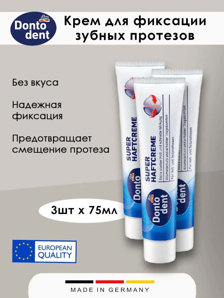 Dontodent Haftcreme denture fixing cream ensures secure hold and comfortable wearing of dentures all day long. The package contains 75 grams of product. This fixing cream creates a strong bond between the denture and gum, preventing the denture from shifting while eating and talking. It also forms a protective layer that prevents small food particles from getting under the denture, providing additional comfort and hygiene. Dontodent Haftcreme is easy to apply and tasteless, which does not affect the sense of taste. Its formula is designed for safe and effective use. For best results, carefully read the instructions on the package before use. This product will help you feel confident and comfortable in any situation! Quantity: 3 pcs.