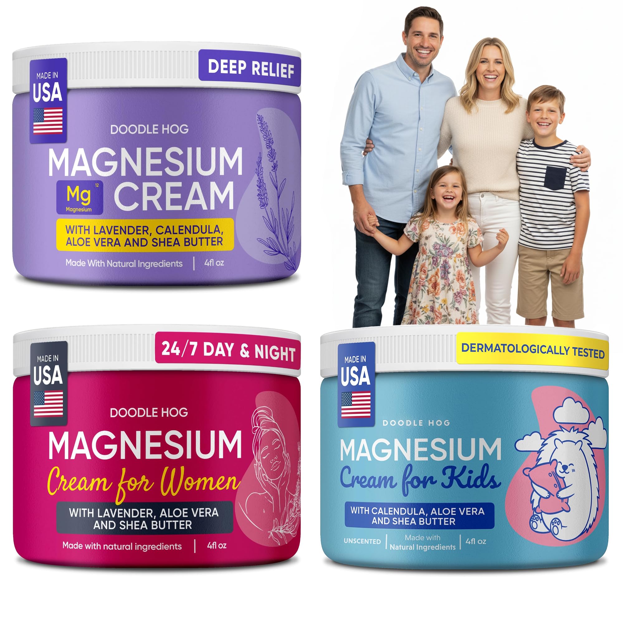 This Family Magnesium Bundle brings together three specially crafted creams designed for every member of the household. The Men's and Women's formulas, both infused with calming lavender, are ideal for nightly routines and creating a sense of relaxation. For kids, the Unscented cream provides the same gentle magnesium care without added fragrance — perfect for sensitive skin or scent-free preferences. All formulas are made in USA with carefully selected ingredients, free from parabens, dyes, and artificial fragrances. A complete magnesium care set for the whole family.JUST THE RIGHT AMOUNT OF MG: Each teaspoon of nighttime magnesium cream contains a robust amount of magnesium which enhances the calming feature of the product. FAMILY-FRIENDLY FORMULA: Lavender-scented creams for parents offer a light, calming aroma, while the unscented version is crafted for kids with sensitive skin or scent-free preferences. Together, they provide gentle, soothing, and nourishing magnesium care for the whole family. MADE WITH NATURAL INGREDIENTS: Formulated with lavender, calendula, aloe vera, and shea butter to provide gentle, soothing, and nourishing care. This bundle is designed for both adults and kids, offering a comforting blend of natural ingredients suitable for the whole family. SUPPORT KID'S HEALTH: Our topical magnesium rub for kids nourishes, soothes, and protects children's delicate skin while promoting relaxation and overall well-being. Enriched with essential vitamins, it is perfect for kids' better sleep and relief. DEEP RELIEF: Our topical magnesium lotion for sleep helps relax muscles, as well as nourishes, soothes, and protects delicate skin while promoting relaxation and overall well-being. Enriched with essential vitamins, it is perfect for better sleep and relief.