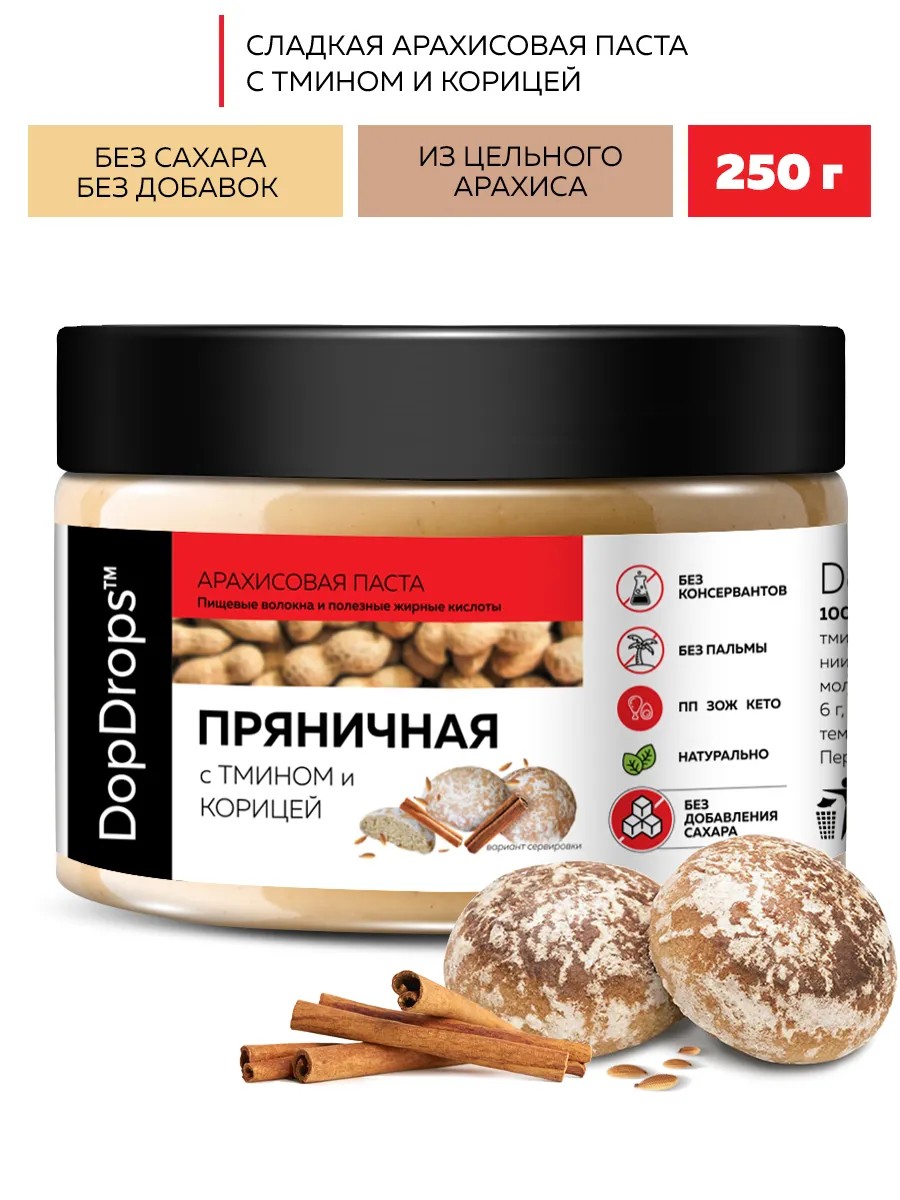 Арахисовая пряничная паста DopDrops – это натуральный ароматный продукт, изготовленный из свежеиспеченного арахиса и ароматных пряностей. Паста из арахиса без сахара станет незаменимым дополнением к вашему правильному питанию, а также изысканным угощением для всей семьи, ведь это не только вкусный, но и полезный продукт с огромным количеством витаминов и необходимых микроэлементов.