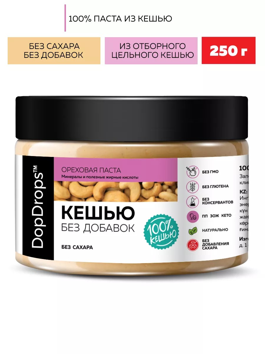 Ореховая паста DopDrops Кешью - это нежнейшая крем-паста из запеченных ядер кешью высочайшего качества, собранных в Юго-Восточной Азии. Диетический продукт без сахара, без глютена, без лактозы, без консервантов, который отличается уникальным сочетанием вкуса и пользы.