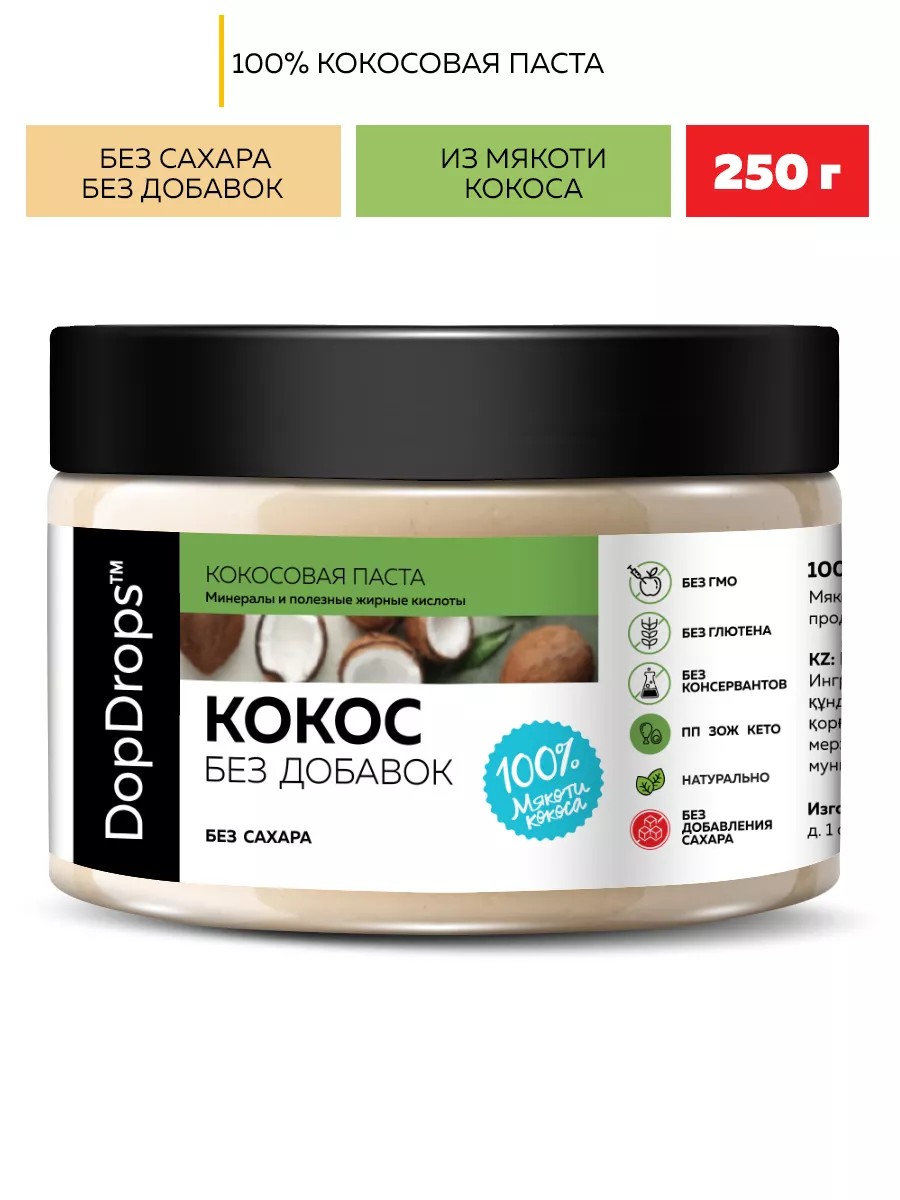 Кокосовая паста DopDrops - это 100% натуральный продукт без сахара с ярким вкусом и утонченным ароматом. Мякоть индонезийского кокоса смолота без нагрева в мягкий крем, чтобы вы получили максимум вкуса и пользы от этого изысканного десерта.