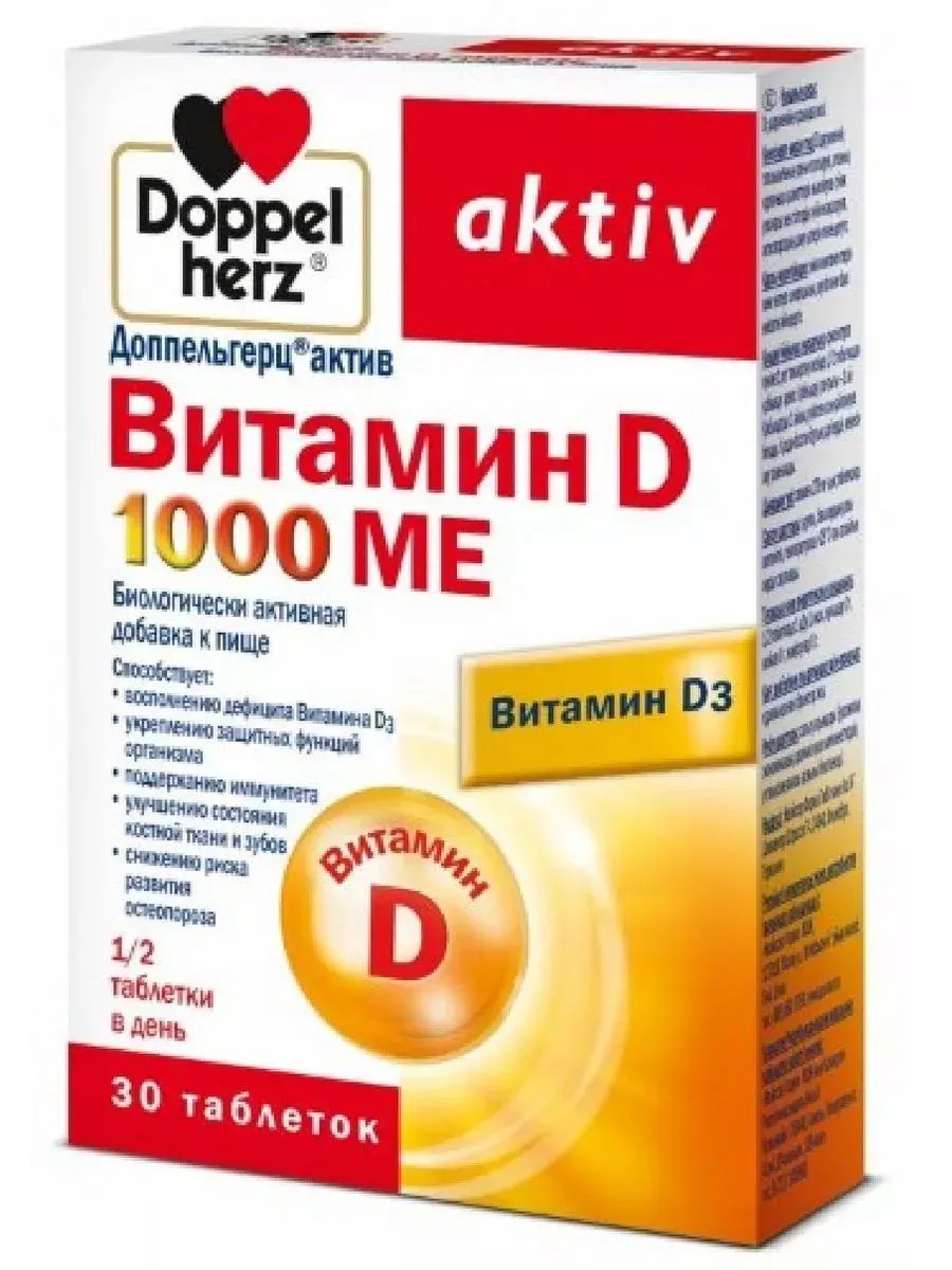 DOPPELHERZ ACTIVE VITAMIN D 1000 IU N30 TABLETS 278 MGDOPPELHERZ ACTIVE VITAMIN D 1000 IU - helps replenish vitamin D3 deficiency, strengthen the body's defenses, maintain immunity and improve psycho-emotional state (mood), improve the condition of bone tissue and teeth, reduce the risk of osteoporosis. Biologically active food supplement (BAA)