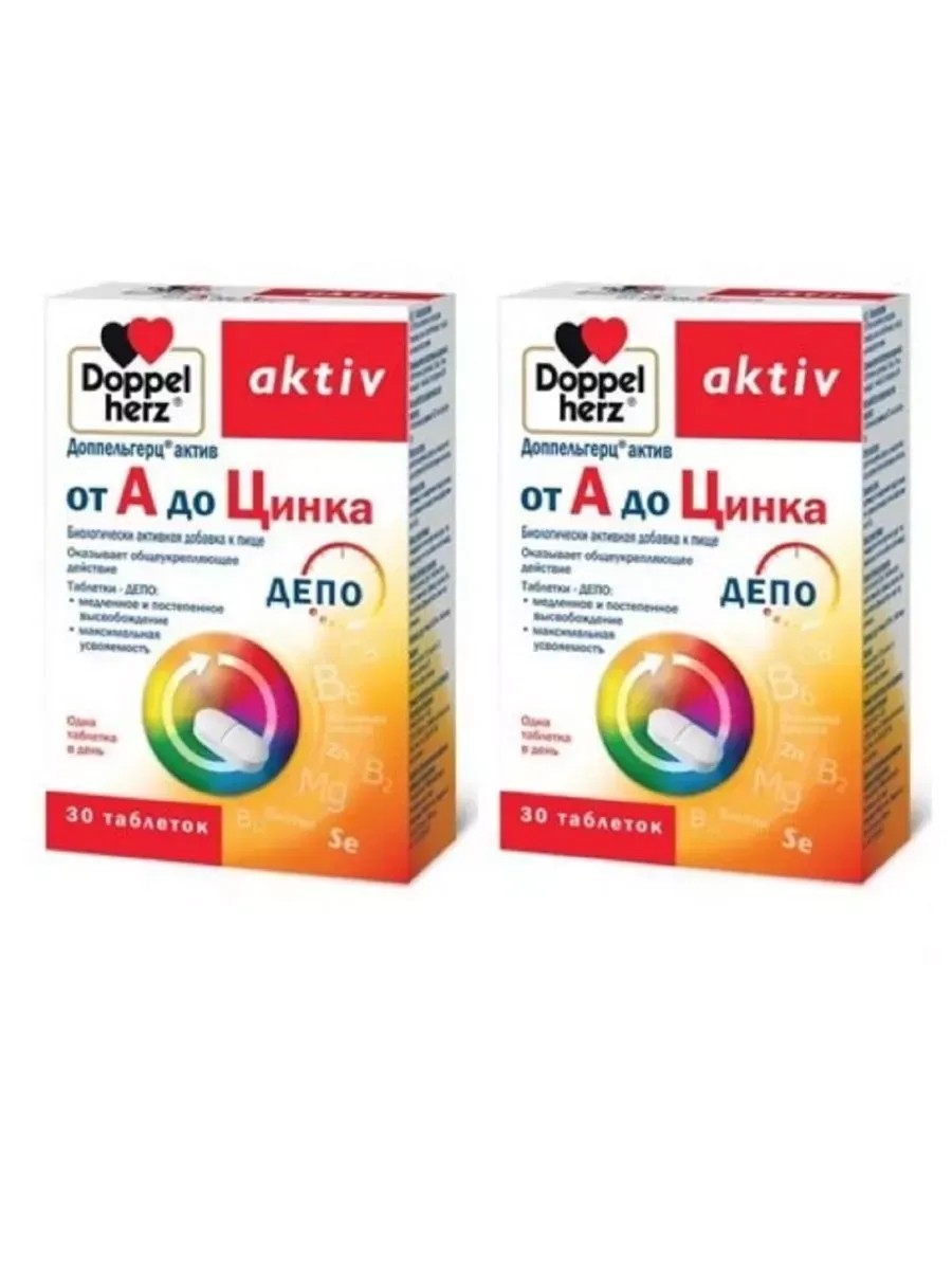 Доппельгерц актив от А до Цинка предназначен для активных и деловых людей, жизнь которых связана с повышенной умственной, физической и эмоциональной нагрузкой, а также для тех, кто хочет всегда оставаться бодрым и энергичным. Он включает в себя 13 жизненно важных витаминов и 11 минеральных веществ, способствующих повышению сопротивляемости организма к стрессовым ситуациям и неблагоприятным факторам внешней среды.Для оптимального снабжения организма питательными веществами специалисты компании нашли решение - была разработана специальная таблетка-депо, которая обеспечивает медленное и постепенное высвобождение питательных веществ в течение всего дня. Таким образом, необходимые человеку витамины и минеральные вещества хорошо воспринимаются организмом и оптимально усваиваются.Показания к применению Доппельгерц актив От А до Цинка:Профилактика и лечение гиповитаминозов, авитаминозов и дефицита минеральных веществ;Недостаточное или несбалансированное питание;Снижение умственной и физической работоспособности, усталость, ухудшение концентрации внимания;Профилактика и лечения синдрома «хронической усталости»;Для улучшения функциональной деятельности сердечно-сосудистой и нервной систем;В период реконвалесценции после перенесенных заболеваний, хирургических операций и лучевой терапии;Для повышения иммунитета и сопротивляемости организма к неблагоприятным факторам внешней среды, стрессовым ситуациям.ежедневная доза (= 1 таблетка) содержит:Витамин A 800 мкгБиотин 100 мкгВитамин B1 3,5 мгВитамин B2 4 мгВитамин B6 5 мгВитамин B12 2,5 мкгВитамин C 150 мгВитамин D3 5 мкгВитамин E 24 мгФолиевая кислота 450 мкгВитамин K 20 мкгНикотинамид (витамин PP) 18 мгПантотенат кальция 12 мгКальций 120 мгМагний 45 мгХром 25 мкгЖелезо 2,1 мгЙод 100 мкгМедь 0,9 мгМарганец 0,9 мгМолибден 20 мкгФосфор 92 мгСелен 10 мкгЦинк 5 мгУказания для больных сахарным диабетом: 1 таблетка соответствует 2,0 ккал и 0,03 хлебных единиц.