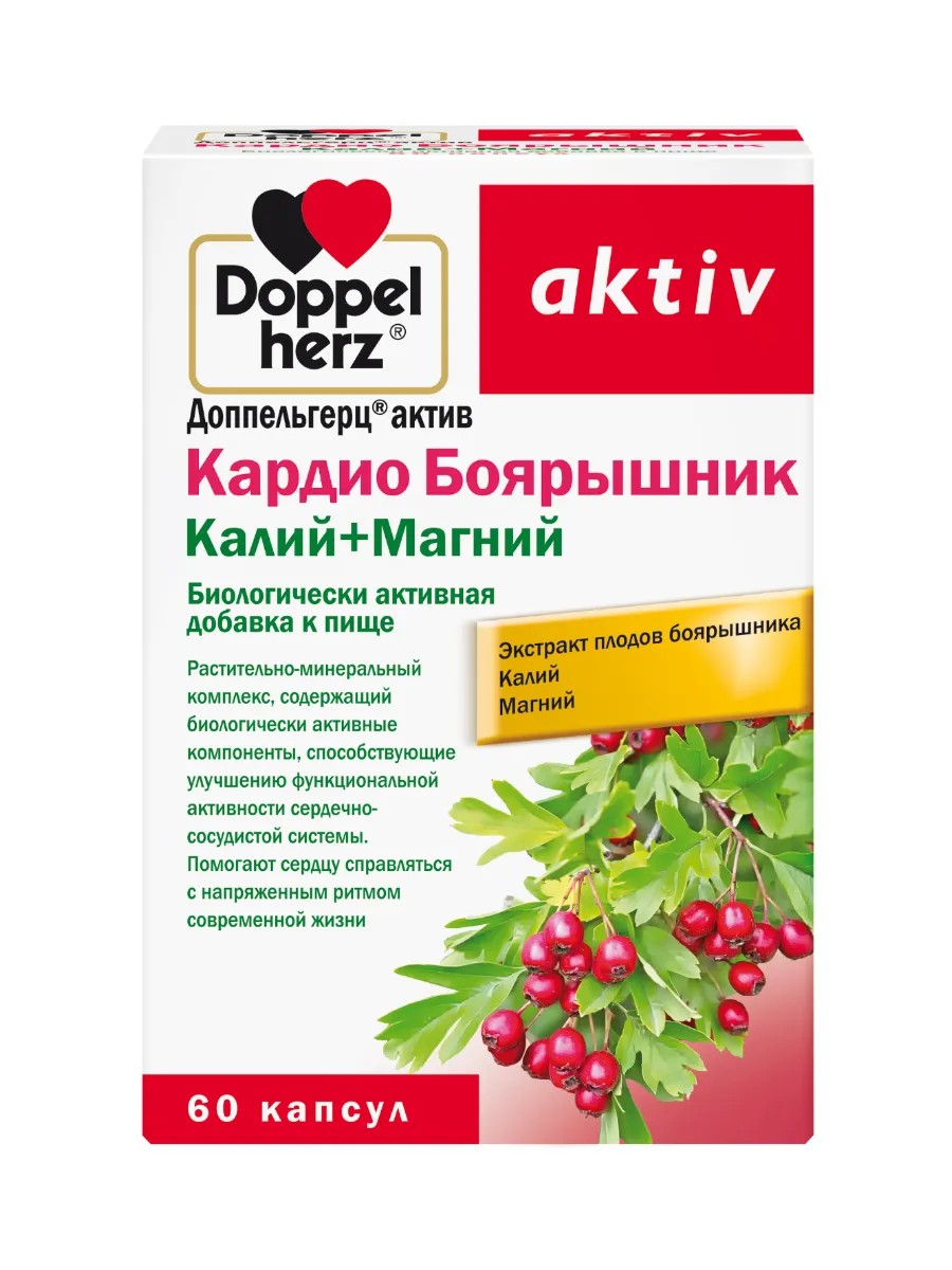 Доппельгерц актив Кардио Боярышник Калий+Магний - растительно-минеральный комплекс, содержащий биологически активные компоненты, способствующие улучшению функциональной активности сердечно-сосудистой системы.