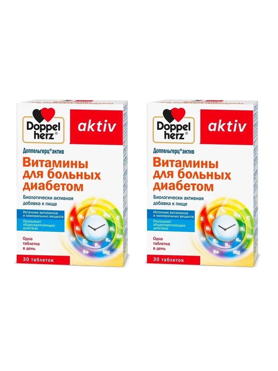 Доппельгерц Актив Витамины для больных диабетом - это биологически активная добавка, созданная для людей, страдающих диабетом 1 и 2 типов. Каждая таблетка содержит в своем составе пять важных витаминов (B1, B6, B12, D3 и фолиевая кислота), необходимых для поддержания здоровья человека с диабетом. Эта добавка помогает контролировать уровень глюкозы в крови, улучшает обмен веществ, снижает риск сердечно-сосудистых заболеваний. Принимать таблетки "Doppelherz Aktiv Витамины для больных диабетом" можно как часть комплексной терапии при диабете, а также для профилактики возможных осложнений. Принимая данный комплекс, восполняющий повышенную потребность в витаминах, микроэлементах и минеральных веществах у больных сахарным диабетом, необходимо помнить, что это не заменяет основную программу лечения сахарного диабета, а лишь дополняет ее. Также существуют основные правила питания для больных диабетом в сочетании с надлежащим образом жизни, достаточной физической активностью, контролем за весом и приемом лекарственных препаратов, рекомендованных врачом.