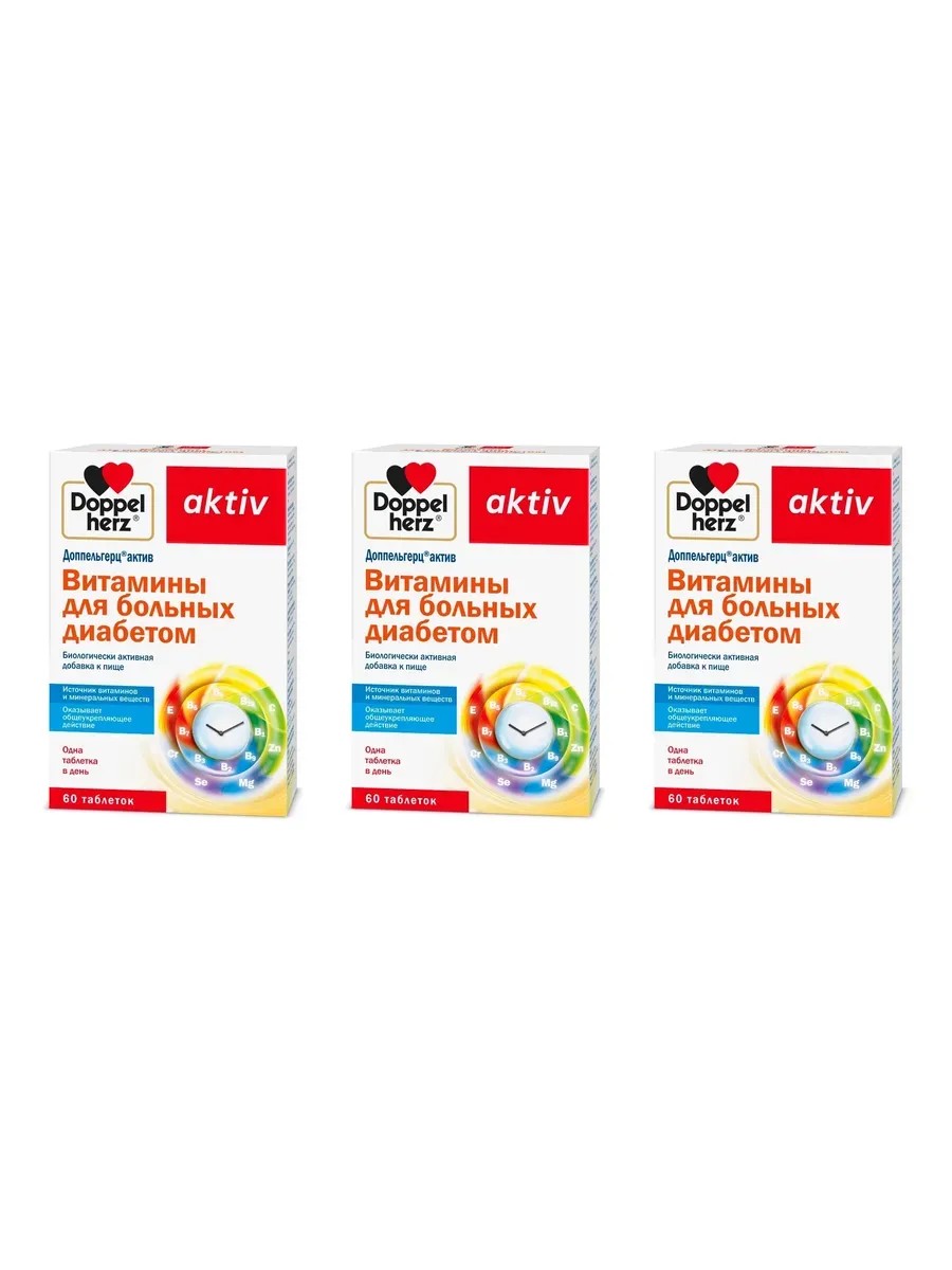 Доппельгерц Актив Витамины для больных диабетом - это биологически активная добавка, созданная для людей, страдающих диабетом 1 и 2 типов. Каждая таблетка содержит в своем составе пять важных витаминов (B1, B6, B12, D3 и фолиевая кислота), необходимых для поддержания здоровья человека с диабетом. Эта добавка помогает контролировать уровень глюкозы в крови, улучшает обмен веществ, снижает риск сердечно-сосудистых заболеваний. Принимать таблетки "Doppelherz Aktiv Витамины для больных диабетом" можно как часть комплексной терапии при диабете, а также для профилактики возможных осложнений. Принимая данный комплекс, восполняющий повышенную потребность в витаминах, микроэлементах и минеральных веществах у больных сахарным диабетом, необходимо помнить, что это не заменяет основную программу лечения сахарного диабета, а лишь дополняет ее. Также существуют основные правила питания для больных диабетом в сочетании с надлежащим образом жизни, достаточной физической активностью, контролем за весом и приемом лекарственных препаратов, рекомендованных врачом.