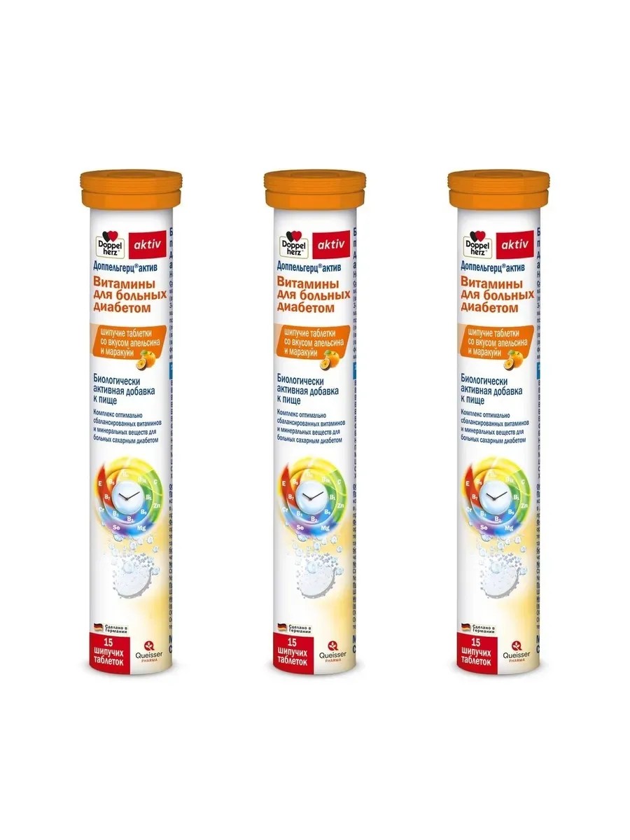 | Торговое наименование | биологически активная добавка к пище "Доппельгерц® актив Витамины для больных диабетом (шипучие таблетки со вкусом апельсина и маракуйи)" (шипучие таблетки массой 6,5 г) |