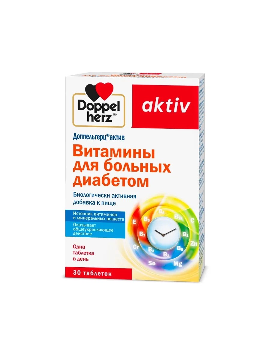 ДОППЕЛЬГЕРЦ Актив витамины для больных диабетом - специально разработанный комплекс витаминов и минеральных веществ для больных сахарным диабетом.Витамины участвуют во всех процессах обмена веществ, повышая устойчивость организма к неблагоприятным внешним факторам, микроорганизмам и вирусам. недостаточное поступление витаминов и минеральных веществ в организм больного сахарным диабетом - это один из факторов риска возникновения серьезных осложнений, в первую очередь таких, как ретинопатия (поражение сосудов сетчатки) и полинейропатия (поражение сосудов почек). Другое частое осложнение сахарного диабета - поражение периферической нервной системы (нейропатии).Большинство витаминов не накапливаются в организме, поэтому больным, страдающим сахар- ным диабетом, необходим регулярный прием препаратов, содержащих витамины и различные макро- и микроэлементы. Поступление достаточного количества витаминов способствует укреп- лению организма, улучшая его иммунный статус, и предупреждает возникновение осложнений. Специально разработанный для больных сахарным диабетом витаминно-минеральный комплекс содержит 10 жизненно важных витаминов, а также цинк, хром, селен и магний.Ежедневная порция (= 1 таблетка) содержит:Витамин Е 42 мгВитамин В12 9мкгБиотин 150 мкгФолиевая кислота 450 мкгВитамин C 200 мгВитамин B6 3 мгПантотенат кальция 6 мгВитамин В1 2 мгНикотинамид 18 мгВитамин B2 1,6 мгХром (III хлорид) 60 мкгСелен (селенит) 39 мкгМагний (оксид) 200 мгЦинк (глюконат) 5 мгРекомендуется:-Для предупреждения развития осложнений;-Для коррекции нарушений обмена веществ у больных сахарным диабетом;-Для восполнения недостатка витаминов и минеральных веществ даже при соблюдении строгой диеты;-Для восстановления организма и улучшения состояния после перенесенных заболеваний;-Для улучшения общего самочувствия.