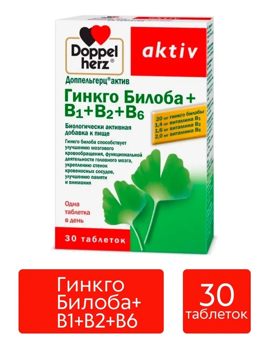 Doppel Herz Doppel Herz A source of flavonol glycosides, an additional source of vitamins B1, B2, and B6. Improves cerebral circulation, brain function, strengthens blood vessel walls, and improves memory and attention. Contraindications: Individual intolerance to the components, pregnant and lactating women. Recommended use: Adults take 1 tablet daily with meals. Duration of use: 2 months. After a break of 1 month, repeated administration is possible. It is recommended to consult a doctor before use. Shelf life: 3 years. Storage conditions: Store in a dry place at a temperature not exceeding 25°C. Keep out of reach of children! Nutritional and energy value: 1 tablet contains 1 kJ / 1 kcal, proteins 0 g, fats 0.1 g, carbohydrates 0 g. Doppelherz aktiv Doppelherz aktiv ginkgo biloba + in 1 + in 2 + in 6