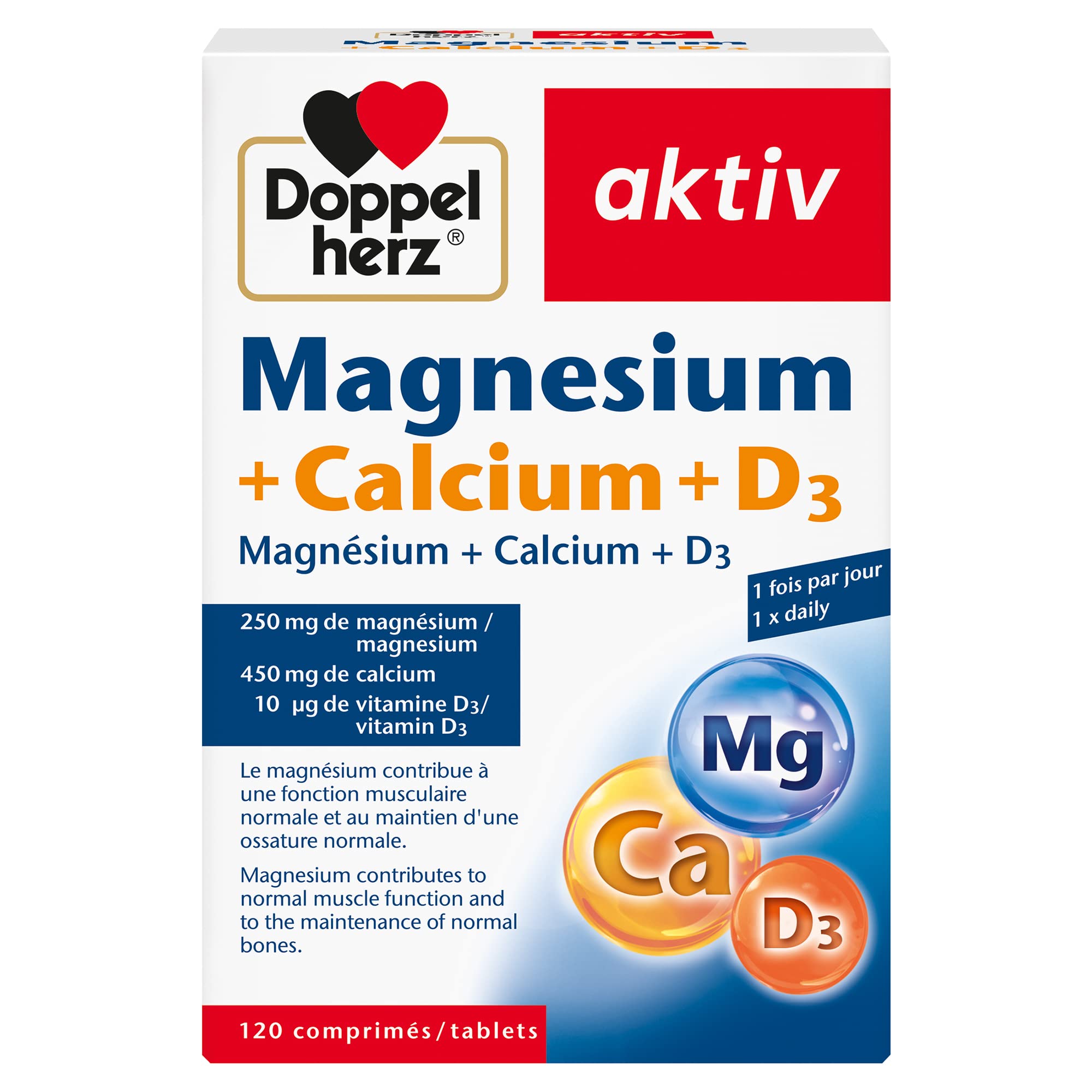 Magnesium and calcium are minerals that are of great importance for our muscles and bones. When the diet is unbalanced, magnesium and calcium intakes are often not optimal. In a large part of the population, calcium intake does not meet nutritional recommendations. The body can produce vitamin D itself through regular exposure of the skin to the sun. However, in our latitudes, this self-production is often insufficient. Magnesium, as an essential mineral, contributes to the normal functioning of muscles. Calcium, for its part, is necessary to maintain normal bones. Vitamin D contributes to the absorption and normal use of calcium, particularly its integration into bones. Magnesium contributes to the normal functioning of muscles and the nervous system as well as normal energy metabolism. Calcium contributes to the maintenance of normal bones, normal blood clotting and normal muscle function. Vitamin D contributes to the normal absorption and use of calcium and the maintenance of normal bones. Doppelherz aktiv Magnesium Calcium D3 Remarks: The recommended daily dose indicated should not be exceeded. Food supplements do not replace a balanced and varied diet and a healthy lifestyle. Keep out of reach of young children. Not suitable for children and adolescents. Store dry and at a temperature not above 25 C. Directions for use: Swallow one tablet with a meal every day with plenty of water. The tablets can be split in two if necessary. Ingredients: Calcium carbonate, magnesium oxide, microcrystalline cellulose bulking agent, polyvinylpyrrolidone bulking agent, hydroxypropyl methylcellulose glazing agent, fatty acid anti-caking agent, cross-linked sodium carboxymethyl cellulose anti-caking agent, magnesium salts of fatty acid anti-caking agent, polyethylene glycol bulking agent, cholecalciferol Queisser is a brand of German origin founded in 1897 and which offers a wide range of products. These range from medical products, pharmaceuticals and cosmetics. Queisser specializes in high quality production thanks to many years of experience thanks to which this brand offers modern and innovative products. INGREDIENTS Calcium carbonate, magnesium oxide, microcrystalline cellulose bulking agent, polyvinylpyrrolidone bulking agent, hydroxypropyl methylcellulose glazing agent, fatty acid anti-caking agent, cross-linked sodium carboxymethylcellulose anti-caking agent, magnesium salts of fatty acid anti-caking agent, polyethylene glycol bulking agent, cholecalciferol DIRECTIONS FOR USE Store dry and at a temperature not above 25 C. SAFETY WARNING The indicated recommended daily dose should not be exceeded. Food supplements do not replace a balanced and varied diet and a healthy lifestyle. Keep out of reach of young children. Not suitable for children and adolescents. DOSAGE: Swallow 1 tablet daily with a meal and plenty of water. CONVENIENT DELIVERY: Doppelherz aktiv Magnesium Calcium D3, 120 tablets for your well-being. ESSENTIAL MINERALS: Magnesium for muscles, nervous system energy. Calcium for bones blood clotting. IMMUNE SUPPORT: Vitamin D contributes to the maintenance of normal bones. HEALTHY BONES MUSCLES: Calcium contributes to the maintenance of normal bones and normal muscle function, magnesium to normal muscle function. Le magnésium et le calcium sont des minéraux qui sont d'une grande importance pour nos muscles et nos os. Lorsque l'alimentation est déséquilibrée, les apports en magnésium et en calcium ne sont souvent pas optimaux. Chez une grande partie de la population, l'apport en calcium ne satisfait pas les recommandations nutritionnelles. Le corps peut fabriquer lui-même de la vitamine D grâce à l'exposition régulière de la peau au soleil. Cependant, sous nos latitudes, cette autoproduction est souvent insuffisante. Le magnésium, en tant que minéral essentiel, contribue au fonctionnement normal des muscles. Le calcium, quant à lui, est nécessaire au maintien d'une ossature normale. La vitamine D contribue à l'absorption et à l'utilisation normale du calcium, notamment à son intégration dans les os. Le magnésium contribue au fonctionnement normal des muscles et du système nerveux ainsi qu'au métabolisme énergétique normal. Le calcium contribue au maintien d'une ossature normale, à une coagulation sanguine normale et à une fonction musculaire normale. La vitamine D contribue à l'absorption et à l'utilisation normales du calcium et au maintien d'une ossature normale. Doppelherz aktiv Magnésium Calcium D3 Remarques : La dose journalière recommandée indiquée ne doit pas être dépassée. Les compléments alimentaires ne remplacent pas une alimentation équilibrée et variée et un mode de vie sain. Tenir hors de portée des jeunes enfants. Ne convient pas aux enfants et aux adolescents. Conserver au sec et à une température ne dépassant pas 25 C. Conseil d'utilisation : Avalez chaque jour un comprimé à un repas avec suffisamment d'eau. Les comprimés peuvent être scindés en deux si nécessaire. Ingrédients : Carbonate de calcium, oxyde de magnésium, agent de charge cellulose microcristalline, agent de charge polyvinylpyrrolidone, agent d'enrobage hydroxypropylméthylcellulose, antiagglomérant acides gras, antiagglomérant carboxyméthylcellulose de sodium réticulée, antiagglomérant sels de magnésium d'acides gras, agent de charge polyéthylène glycol, cholécalciférol Queisser est une marque d'origine allemande fondée en 1897 et qui propose une large gamme de produits. Ceux-ci vont des produits médicaux, en passant par les produits pharmaceutiques et les cosmétiques. Queisser est spécialisé dans la production de haute qualité grâce à de nombreuses années d'expérience grâce à quoi cette marque propose des produits modernes et innovants. INGRÉDIENTS Carbonate de calcium, oxyde de magnésium, agent de charge cellulose microcristalline, agent de charge polyvinylpyrrolidone, agent d'enrobage hydroxypropylméthylcellulose, antiagglomér