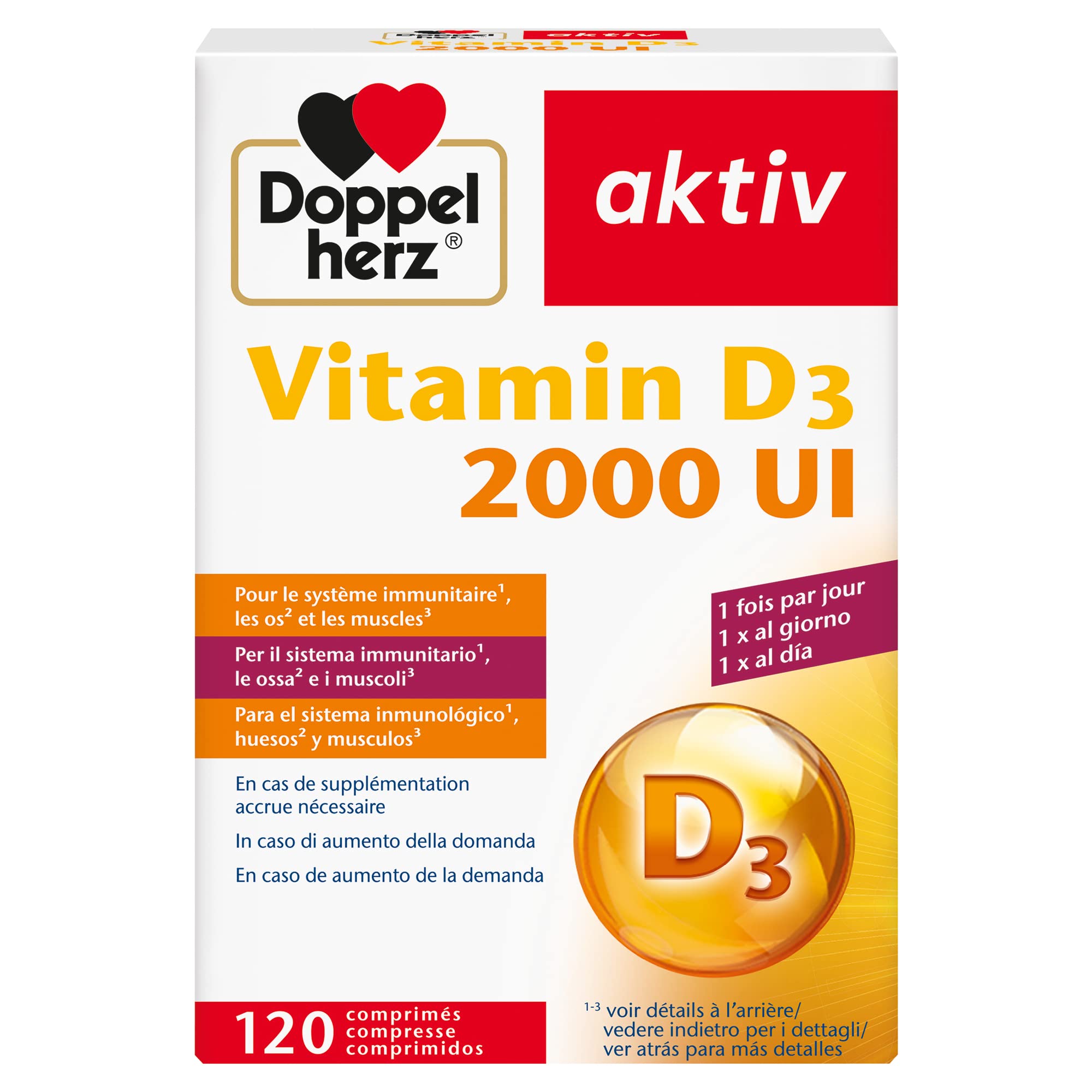 Recent research has shown that vitamin D affects health in different ways. However, in many people, the diet is too low in vitamin D. Vitamin D, also called the "sunshine vitamin", participates in the process of cell division and the normal functioning of the immune system contributes to the maintenance of normal bones contributes to the maintenance of normal muscle function contributes to the normal use of calcium. INGREDIENTS Bulking agent calcium carbonate, bulking agent microcrystalline cellulose, maltodextrin, glazing agent hydroxypropyl methylcellulose, bulking agent isomalt, anti-caking agent magnesium salts of fatty acids, medium chain triglycerides, vitamin D, glazing agent carnauba wax DIRECTIONS FOR USE Store dry and at a temperature not above 25 C. SAFETY WARNING The indicated recommended daily dose should not be exceeded. Food supplements do not replace a balanced and varied diet and a healthy lifestyle. Keep out of reach of young children. This product is not suitable for children, adolescents and pregnant women. It is recommended to check the level of vitamin D in the blood when taking the product for a long time. You should not take other food supplements or medications containing vitamin D without medical advice. The product should not be used if the calcium level in the blood is high (hypercalcemia) or if the urine calcium concentration is high (hypercalciuria). DOSAGE: Take 1 tablet daily without chewing with sufficient liquid. DAILY WELL-BEING: 120 Doppelherz tablets for a good supply of vitamin D3. SUNSHINE IN A TABLET: Vitamin D, to support cell division muscle function. IMMUNITY BONES: Support your immune system, bones teeth with 50 µg (2000 IU) of vitamin D3 per tablet. ESSENTIAL VITAMIN D: An essential dose of vitamin D to support your health in case of limited sun exposure. Take care of yourself in winter. Des recherches récentes ont montré que la vitamine D agissait de différentes manières sur la santé. Néanmoins, chez de nombreuses personnes, l'alimentation est trop pauvre en vitamine D. La vitamine D, également appelée «vitamine du soleil», participe au processus de division cellulaire et au fonctionnement normal du système immunitaire contribue au maintien d'une ossature normale contribue au maintien d'une fonction musculaire normale contribue à l'utilisation normale du calcium. INGRÉDIENTS Agent de charge carbonate de calcium, agent de charge cellulose microcristalline, maltodextrine, agent d'enrobage hydroxypropylméthylcellulose, agent de charge isomalt, antiagglomérant sels de magnésium d'acides gras, triglycérides à chaîne moyenne, vitamine D, agent d'enrobage cire de carnauba MODE D'EMPLOI Conserver au sec et à une température ne dépassant pas 25 C. AVERTISSEMENT DE SÛRETÉ La dose journalière recommandée indiquée ne doit pas être dépassée. Les compléments alimentaires ne remplacent pas une alimentation équilibrée et variée et un mode de vie sain. Tenir hors de portée des jeunes enfants. Ce produit n'est pas adapté aux enfants, aux adolescents et aux femmes enceintes. Il est recommandé de vérifier le taux de vitamine D dans le sang dans le cadre d'une prise prolongée du produit. Il convient de ne pas prendre d'autres compléments alimentaires ou médicaments contenant de la vitamine D sans avis médical. Le produit ne doit pas être utilisé si le taux de calcium dans le sang est élevé (hypercalcémie) ou si la concentration des urines en calcium est élevée (hypercalciurie). DOSAGE : Prendre 1 comprimé par jour sans la croquer avec suffisamment de liquide. BIEN-ÊTRE AU QUOTIDIEN : 120 comprimés de Doppelherz pour une bonne provision de vitamine D3. LE SOLEIL EN COMPRIMÉ : La vitamine D, pour soutenir la division cellulaire la fonction musculaire. IMMUNITÉ OS : Soutenez votre système immunitaire, vos os vos dents avec 50 µg (2000 UI) de vitamine D3 par comprimé. VITAMINE D ESSENTIELLE : Une dose essentielle de vitamine D pour soutenir votre santé en cas d'exposition solaire limitée. Prenez soin de vous en hiver.