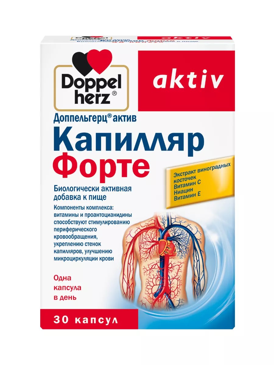 Доппельгерц Актив Капилляр Форте – это биологически активная добавка, содержащая L-аскорбиновую кислоту, экстракт виноградных косточек, никотинамид, D-альфа-токоферол ацетат. Компоненты комплекса: витамины и проаноцианидины способствуют стимулированию периферического кровообращения, укреплению стенок капилляров, улучшению микроциркуляции крови. Взрослым принимать по 1 капсуле 1 раз в день во время еды. Продолжительность приема -1 месяц. После перерыва в 1 месяц возможен повторный прием.