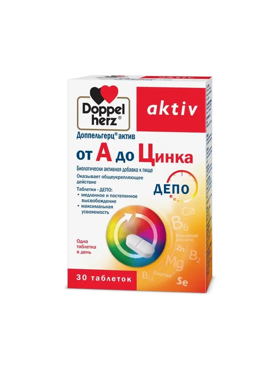 Doppelherz Active from A to Zinc - a complex of vitamins, zinc, vitamin A. This is a biologically active food supplement - a complex preparation containing 13 vitamins and 11 minerals necessary for maintaining health. It helps strengthen the immune system, increase endurance and energy potential of the body. In addition, the preparation helps improve the condition of the skin, hair and nails, as well as normalize the functioning of the cardiovascular and nervous systems. Doppelherz Active from A to Zinc is produced in the form of convenient special depot tablets that are easy to take and store. This drug is an ideal choice for those who want to stay healthy and energetic throughout the day. Method of administration Adults 1 tablet per day with meals. Composition Calcium (calcium) phosphate (phosphorus). Lactose monohydrate. Ascorbic acid (vitamin C). Hydroxypropyl methylcellulose (thickener E 464). Magnesium oxide (magnesium). Starch. Nicotinamide ascorbate (nicotinamide). DL-tocopherol acetate (vitamin E). zinc gluconate (zinc). amorphous silicon dioxide (anti-caking agent E 551). mono- and diglycerides of fatty acids (emulsifier E 471). 3-substituted potassium citrate (stabilizer E 332ii). hydroxypropyl methylcellulose (thickener E 464). calcium-D-pantothenate. calcium salts of fatty acids (stabilizer E 470). polyvinylpyrrolidone (stabilizer E 1201). shellac (glazing agent E 904). titanium dioxide (dye E 171). iron-(II)-fumarate (iron). pyridoxine hydrochloride (vitamin B6). vitamin A. talc (anti-caking agent E 553iii). thiamine nitrate (vitamin B1). riboflavin (vitamin B2). cyanocobalamin (vitamin B12). manganese sulfate (manganese). copper-(II)-sulfate (copper). cholecalciferol (vitamin D3). glycerin (thickener E 422). iron oxide red (dye E 172). water (solvent). Tween 80 (emulsifier E 433). folic acid. phytomenadione (vitamin K). chromium-(III)-chloride (chromium). potassium iodide (iodine). biotin. sodium molybdate (molybdenum). sodium selenate (selenium).