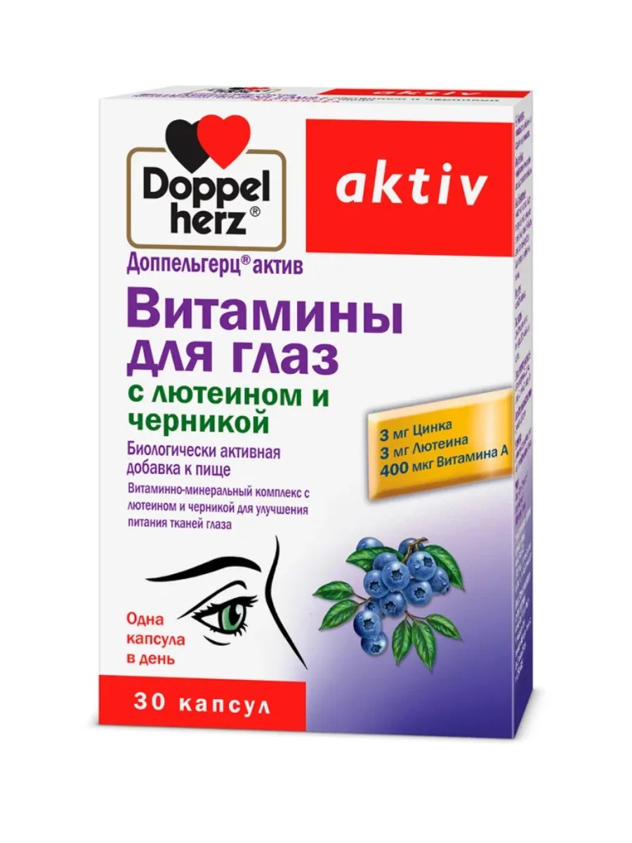 Доппельгерц актив витамины для глаз с лютеином и черникой - биологически активная добавка (БАД) к пище. В его составе находятся витамины, минералы и растительные экстракты для улучшения питания тканей глаза. Рекомендован при компьютерном зрительном синдроме (быстрой утомляемости глаз и снижению зрения в результате работы с компьютером). Ключевые ингредиенты - лютеин и черника, которые способствуют сохранению зрения и улучшению его качества.