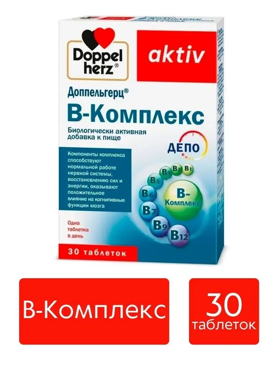 Доппель герц Doppel herz в качестве дополнительного источника витаминов В1, В2, В6, В12, пантотеновой кислоты, фолиевой кислоты, ниацина, биотина. Компоненты комплекса способствуют нормальной работе нервной системы, восстановлению сил и энергии, оказывают положительное влияние на когнитивные функции мозга. Доппельгерц актив Doppelherz aktiv В-комплекс.