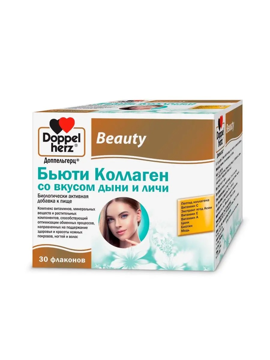 Доппельгерц Бьюти Коллаген со вкусом дыни и личи в питьевых флаконах содержит пептиды коллагена для Вашей красоты, специально подобранный комплекс витаминов и микроэлементов и экстракт ягод асаи.