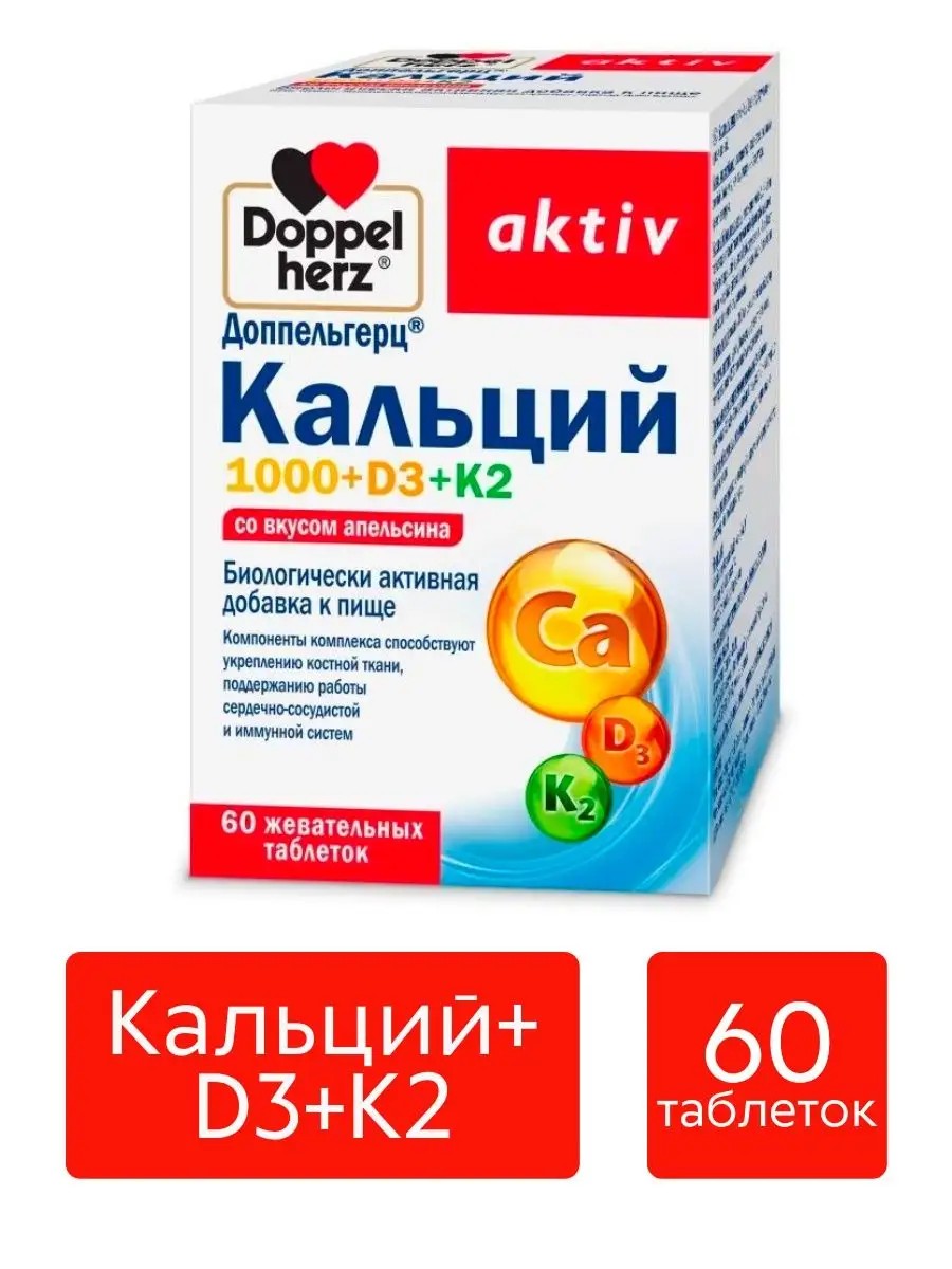 Doppel Herz Doppel Herz The components of the complex help strengthen bone tissue, support the functioning of the cardiovascular and immune systems. Recommendations for use: adults take 2 chewable tablets daily immediately after meals. The tablets should be chewed. Duration of admission is 1 month. If necessary, the intake can be repeated. Before use, consult a doctor. Contraindications: individual intolerance to the components, pregnancy, breastfeeding, carbohydrate metabolism disorders, phenylketonuria. Nutritional and energy value: 2 tablets contain 22 kJ / 6 kcal, fats 0 g, proteins 0 g, carbohydrates 1.2 g. Instructions for patients with diabetes: does not contain bread units. Doppelherz aktiv Calcium 1000, D3, K2