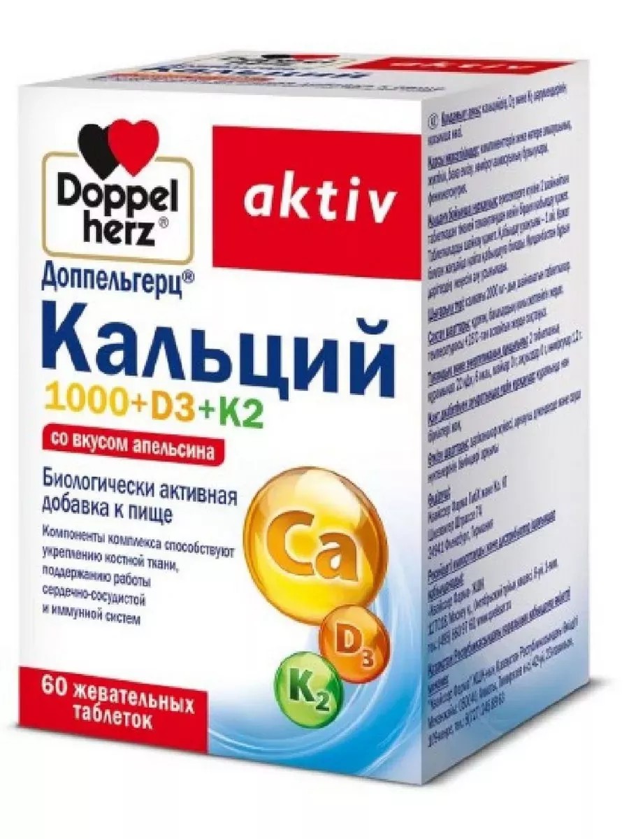 ДОППЕЛЬГЕРЦ АКТИВ КАЛЬЦИЙ 1000+D3+K2 СО ВКУСОМ АПЕЛЬСИНА - Биологически активная добавка (БАД) к пище - Компоненты комплекса способствуют укреплению костной ткани, поддержанию работы сердечно-сосудистой и иммунной систем.