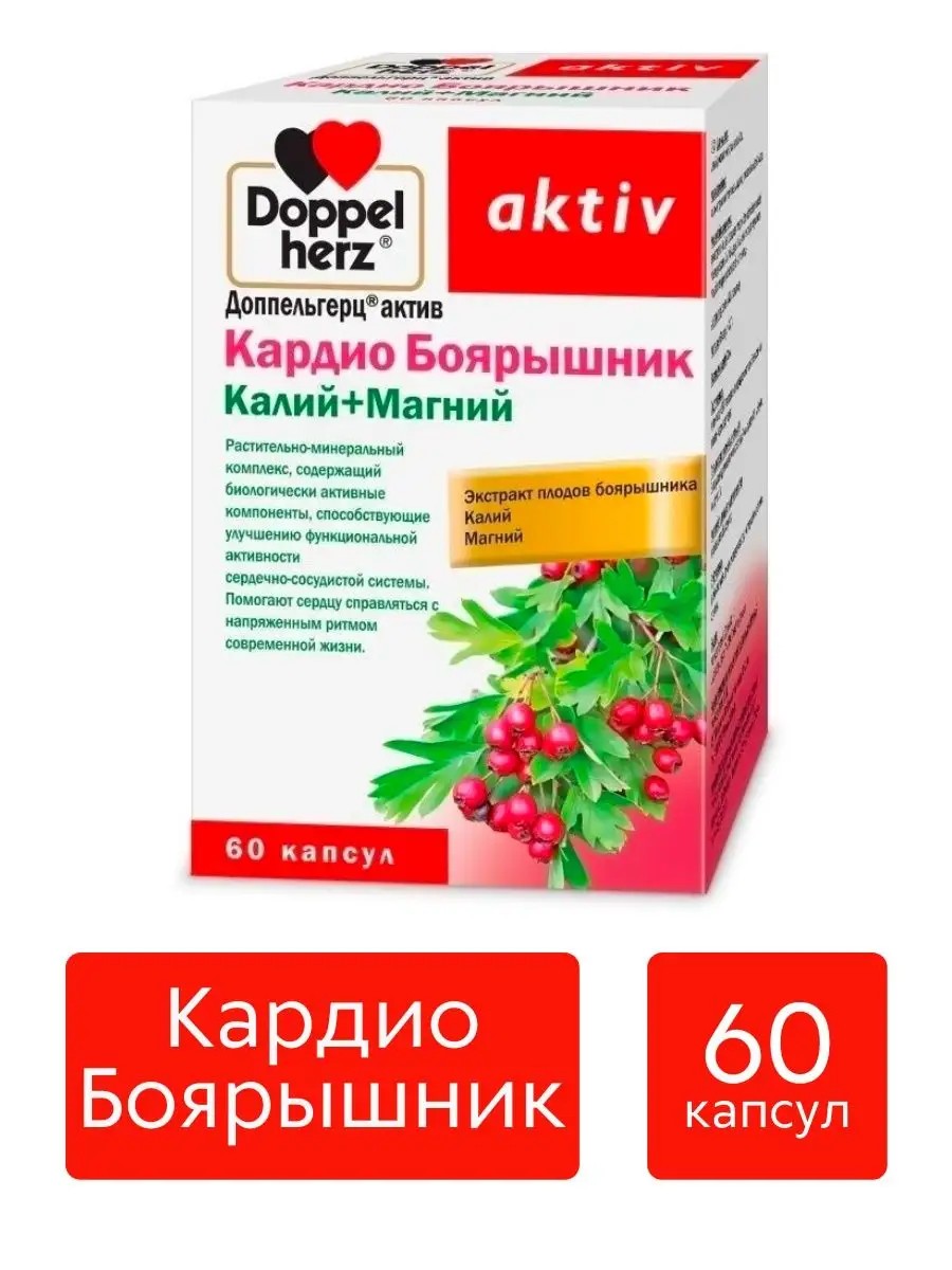 Доппель герц Doppel herz Актив Кардио Боярышник Калий + Магний - Растительно-минеральный комплекс, содержащий биологически активные компоненты, способствующие улучшению функциональной активности сердечно-сосудистой системы. Состав комплекса Доппельгерц Актив Кардио Боярышник Калий + Магний способствует поддержанию здоровья сердца в напряжённом ритме современной жизни.- **Боярышник** способствует нормализации ритма сердечной деятельности, расширяет коронарные сосуды и усиливает коронарное кровообращение. Экстракт боярышника умеренно снижает артериальное давление, улучшает функции сосудистых стенок, нормализует венозное давление, способен расширять периферические сосуды и сосуды внутренних органов.- **Магний** - жизненно важный элемент с многочисленными полезными свойствами. Участвует более чем в 300 различных процессах обмена веществ, в основном связанных с выработкой или потреблением энергии. **Калий** имеет большое значение для нормальной деятельности нервной и сердечно-сосудистой систем. Доппельгерц актив Doppelherz aktiv Кардио Боярышник Калий + Магний