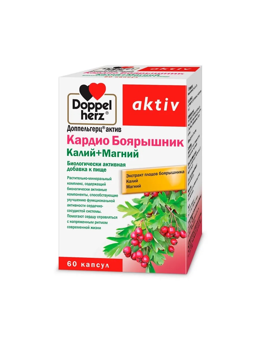 Доппельгерц актив Кардио Боярышник Калий+Магний - растительно-минеральный комплекс, содержащий биологически активные компоненты, способствующие улучшению функциональной активности сердечно-сосудистой системы.Помогают сердцу справляться с напряженным ритмом современной жизни.3 капсулы (суточная доза) содержат: Кол-во % от рекомендуемого уровня суточного потребленияКалий 450 мг 12Магний 150 мг 37,5Боярышник - способствует нормализации ритма сердечной деятельности, расширяет коронарные сосуды и усиливает коронарное кровообращение, уменьшает возбудимость миокарда. Экстракт боярышника умеренно снижает артериальное давление, улучшает функции сосудистых стенок, нормализует венозное давление, способен расширять периферические сосуды и сосуды внутренних органов. Понижает возбудимость центральной нервной системы, улучшает сон и общее состояние организма. Отмечено мягкое успокаивающее действие боярышника.Боярышник используется при функциональных расстройствах сердечной деятельности, ИБС, ангионеврозах, при повышенном артериальном давлении. Он рекомендуется при недостаточности кровообращения у лиц пожилого возраста, особенно в климактерическом периоде, атеросклерозе и сердечных неврозах.Магний - жизненно важный элемент с многочисленными полезными свойствами. Участвует более чем в 300 различных процессах обмена веществ - в основном связанных с выработкой или потреблением энергии. Магний относится к числу активаторов ферментов, усиливает их действие. Он влияет на нервно-мышечную возбудимость и функцию сердца, обладает кардиопротекторным действием, участвует в регуляции артериального давления, снижает содержание холестерина в крови, предупреждает появление камней в почках. Магний играет важную роль в энергетическом обмене, формировании костной ткани, а также в поддержании электролитного баланса. Последние исследования также показали, что магний играет важную роль для снижения риска сердечно-сосудистых заболеваний и остеопороза.Калий - имеет большое значение для нормальной деятельности нервной и сердечно-сосудистой систем. Участвует в процессах регуляции сердечного ритма, мышечного сокращения, вместе с натрием влияет на водный баланс организма, способствует стабилизации артериального давления. Играет важнейшую роль в возникновении и передаче электрохимических импульсов на клеточном уровне. Регулирует процесс проникновения питательных веществ через клеточные мембраны. Калий необходим для секреции некоторых гормонов. Секреция стрессовых гормонов вызывает уменьшение соотношения калий/натрий вне и внутри клеток. В результате этого в условиях стресса повышается потребность организма в калии. При заболеваниях почек, диарее, применении диуретиков или слабительных средств возможно резкое понижение уровня калия в крови. Курение и употребление кофе уменьшают всасывание калия.