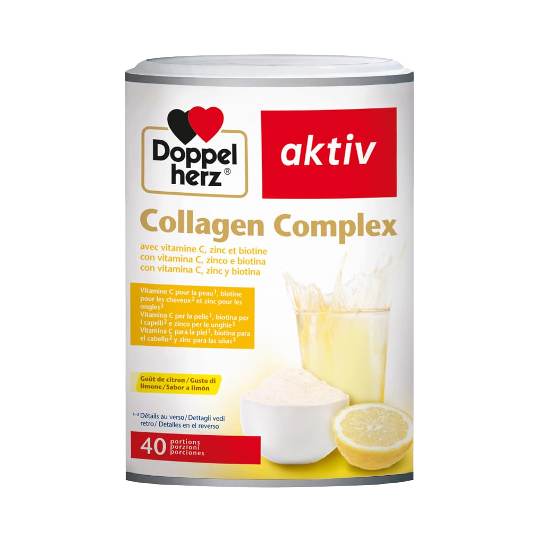 Doppelherz Collagen Complex – Poudre au collagène hydrolysé 5000 mg – Vitamine C, Zinc Biotine – Pour peau, cheveux et ongles – Goût citron – 40 doses