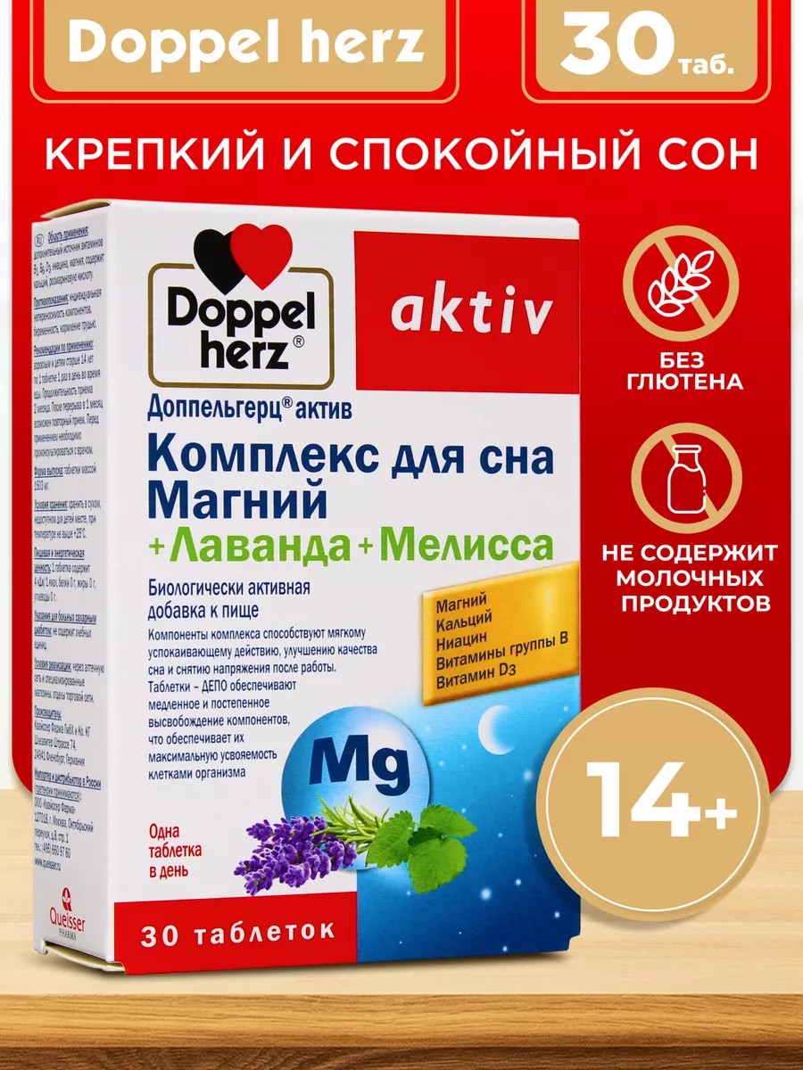 Доппельгерц Актив Комплекс для сна с магнием, лавандой и мелиссой - это биологически активная добавка к пище, специально разработанная для эффективного улучшения качества сна. В состав препарата входят магний, который способствует снижению возбуждения в нервных клетках и расслаблению сердечной мышцы, а также экстракты лаванды и мелиссы, обладающие мягким седативным, гипотензивным и мочегонным действием, а также, оказываетуспокаивающее действие на нервную систему при стрессорных реакциях. Компоненты комплекса способствуют мягкому успокаивающему действию, улучшению качества сна и снятию напряжения после работы.