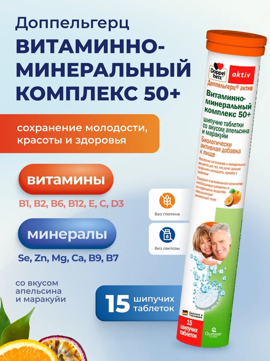 Если вам за 50 и вы хотите сохранить здоровье, энергию и хорошее самочувствие, обратите внимание на Доппельгерц Актив Витаминно-минеральный комплекс 50+. Это шипучие таблетки с приятным вкусом апельсина и маракуйи, которые содержат все необходимые витамины и минералы для поддержки организма в зрелом возрасте.