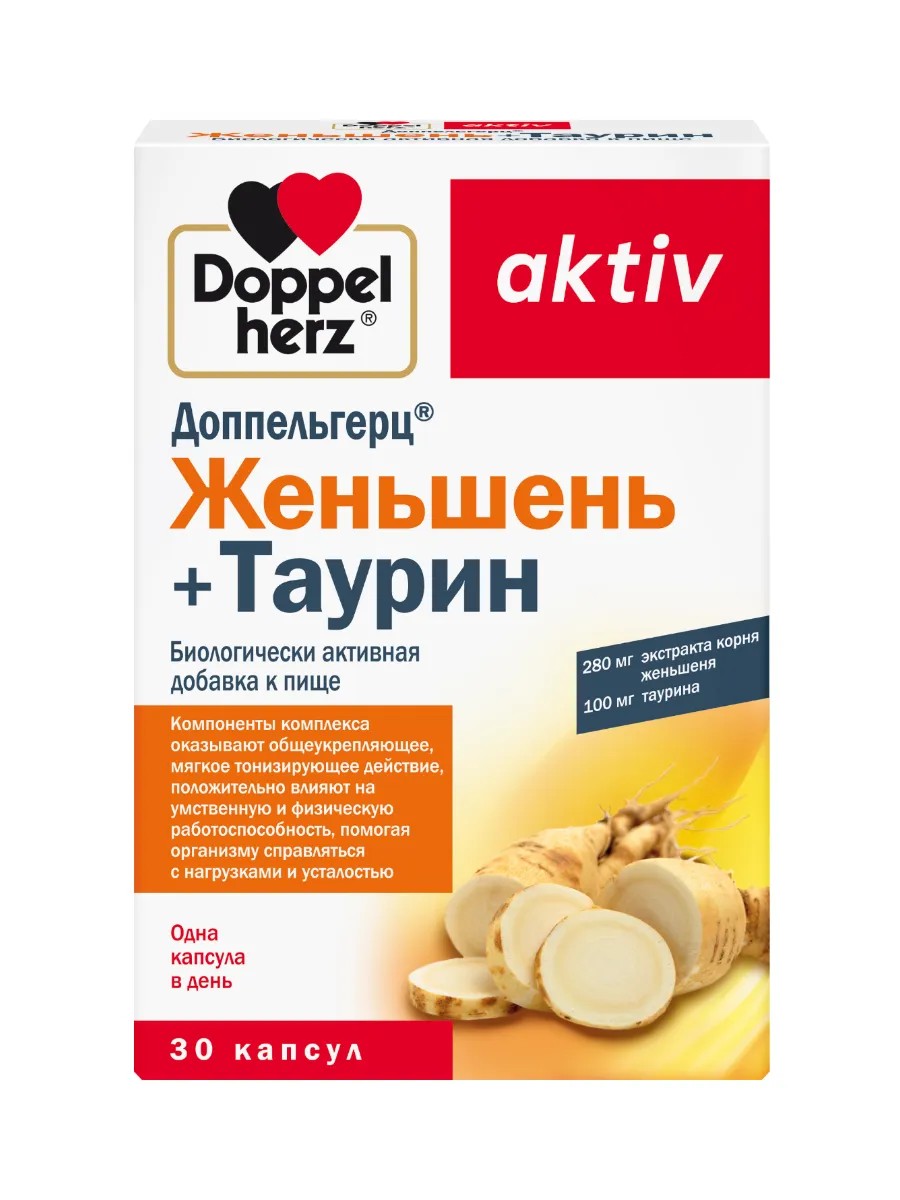 Доппельгерц актив Женьшень+Таурин» - комплекс оказывают общеукрепляющее, мягкое тонизирующее действие, положительно влияют на умственную и физическую работоспособность, помогая организму справляться с нагрузками и усталостью.