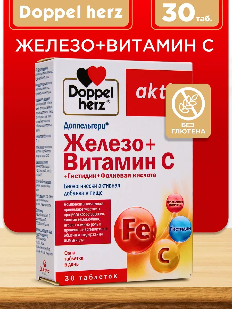 ДОППЕЛЬГЕРЦ АКТИВ ЖЕЛЕЗО+ВИТАМИН С+ГИСТИДИН+ФОЛИЕВАЯ КИСЛОТА - Биологически активная добавка (БАД) к пище - Компоненты комплекса принимают участие в процессе кроветворения, синтезе гемоглобина, отвечающего за транспорт кислорода в крови, а также играют важную роль в процессе энергетического обмена и поддержании иммунитета.