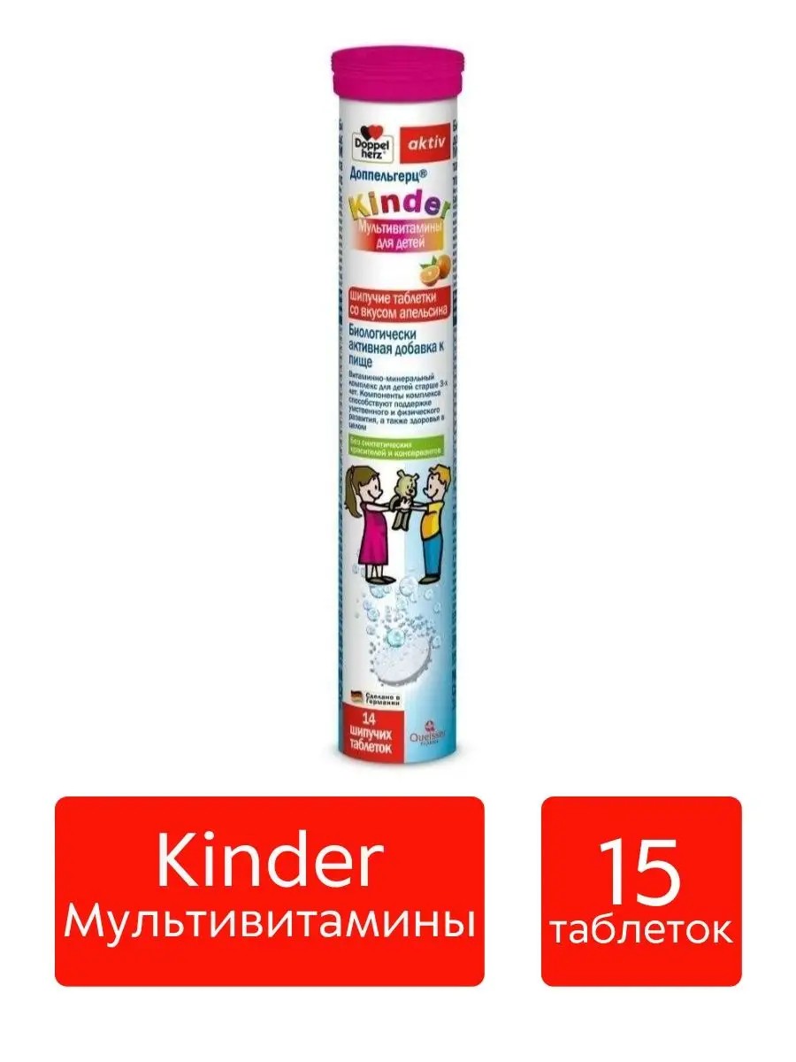 Doppel Herz Doppel Herz The complex's components support mental and physical development, as well as overall health. Contains no synthetic colors or preservatives. 1 tablet contains: Vitamin A, mcg 200 Vitamin D3, mcg / IU 7/280 Vitamin E, mg 2 Vitamin K, mcg 25 Vitamin C, mg 15 Vitamin B1, mg 0.5 Vitamin B2, mg 0.7 Vitamin B3, mg 6 Vitamin B5, mg 2 Vitamin B6, mg 0.8 Vitamin, B12, mcg 0.5 Vitamin Bc, mcg 100 Biotin, mcg 10 Iron, mg 5 Copper, mg 0.4 Selenium, mcg 10 Zinc, mg 4.5 Iodine, mcg 90 Nutritional and energy value: 1 effervescent tablet contains 92 kJ / 22 kcal, proteins 0 g, fats 0 g, carbohydrates 4.4 g. Instructions for patients with diabetes: 1 effervescent tablet contains 0.3 bread units. Indications: additional source of vitamins C, E, D3 (280 IU per 1 tablet), K, A, B2, B6, B1, B12, niacin, pantothenic acid, folic acid, biotin, iron, iodine, zinc, copper, selenium. Contraindications: individual intolerance to the components of the dietary supplement, carbohydrate metabolism disorders, conditions in which iodine preparations are contraindicated. Directions for use: children over 3 years old, take 1 tablet daily immediately after meals, dissolve the tablet in a glass of water (200 ml). Duration of administration: 14 days. If necessary, the dose can be repeated. Before use, consult a pediatrician. Children under 14 years of age should take the dietary supplement with the consent and supervision of a pediatrician. Persons with thyroid diseases should consult an endocrinologist before use. Doppelherz aktiv Kinder Multivitamins, 15 effervescent tablets with orange flavor