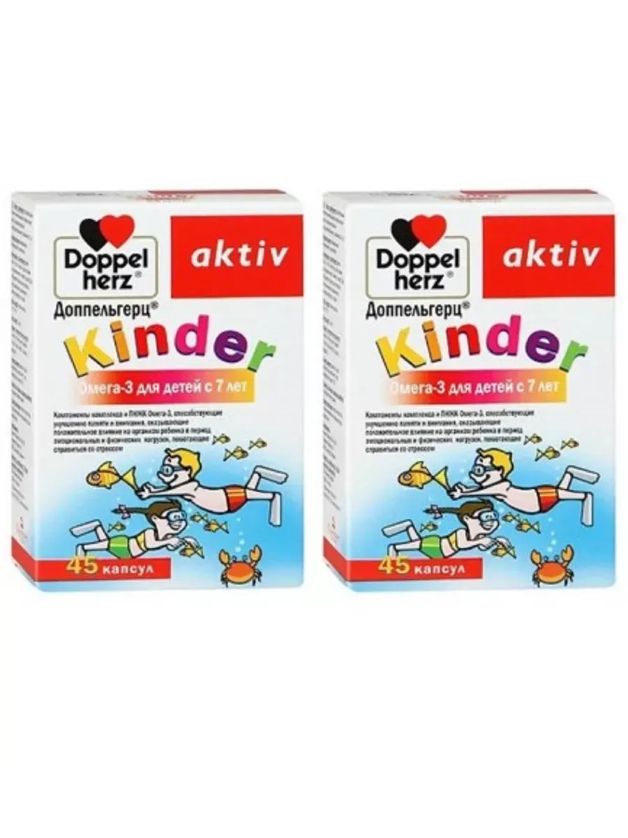 Доппельгерц Kinder Омега-3 для детей с 7 летКомпоненты комплекса и ПНЖК Омега-3, способствующие улучшению памяти и внимания, оказывающие положительное влияние на организм ребенка в период эмоциональных и физических нагрузок, помогающие справиться со стрессом.Вся продукция компании Квайссер Фарма ГмбХ и Ко.КГ производится на основе последних достижений в технологии и соответствует высоким международным стандартам качества GMP.Полиненасыщенные жирные кислоты (ПНЖК) Омега-3 крайне полезны для детского организма. Наиболее важными из них являются альфа-линолевая, эйкозапентаеновая, докозагексаеновая кислоты, которые положительно влияют на состояние сердечно-сосудистой и нервной систем. Жирные кислоты Омега-3 являются строительным материалом для клеточных мембран головного мозга и сетчатки глаз, который способен улучшать функционирование органов зрения, умственное развитие и память у детей. Омега-3 также способствует укреплению иммунитета, является важным компонентом системы защиты организма.Витамин D - участвует в регуляции минерального обмена, необходим для нормального формирования роста костей и зубов у детей. Он также участвует в иммунных реакциях, стимулируя их.Витамин Е - является важнейшим компонентом системы защиты организма. Способствует нормальному развитию и функционированию половой системы.Витамин А - является активным антиоксидантом, играет роль в формировании иммунной системы ребенка, способствует повышению сопротивляемости организма к различным инфекциям. Помогает улучшить цветовое восприятие, важен для обеспечения нормальной зрительной функции.Пищевая и энергетическая ценность:2 капсулы (суточная доза) содержат 10 ккал, 50 кДж, белки 0,2 г, жиры 1 г, углеводы 0 г.Указания для больных сахарным диабетом: не содержит хлебных единиц.