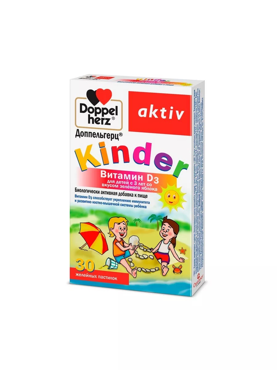 Doppelherz Kinder Vitamin D3 - витаминный комплекс в форме желейных конфет с зеленого яблока для детей от 3 лет. Пастилки содержат 1500 мг витамина D3, который необходим для поддержания здоровья костей, иммунной и сердечно-сосудистой системы. Вкусные и удобные в приеме желейки Doppelherz Kinder Vitamin D3 позволят ребенку получить необходимую дозу витамина без труда. Комплекс прошел все необходимые проверки и рекомендуется педиатрами.
