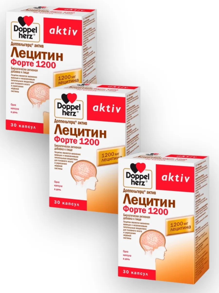 Доппельгерц Актив Лецитин Форте - биологически активная добавка (БАД) к пище в капсулах. Лецитин является жизненно важным и незаменимым питательным веществом для головного мозга и укрепления нервной системы. 1 капсула содержит: лецитин 1200 мг. Лецитин обеспечивает нормальный обмен жиров, способствует улучшению работы мозга, сердечно-сосудистой системы, усвоению витаминов А, D, Е и К, и снижению уровня холестерина в крови. Все клетки организма нуждаются в лецитине, который входит в комплекс витаминов группы В и помогает вырабатывать энергию. Он также необходим для выработки ацетилхолина, обеспечивающего оптимальное функционирование нервной системы. Он необходим для полноценного функционирования нервной системы и мозга.Рекомендуется взрослым по 1 капсуле 1 раз в день во время еды, запивая водой. Продолжительность приема 2 месяца. После перерыва в 1 месяц возможен повторный прием. Перед применением необходимо проконсультироваться с врачом. Упаковка содержит 30 капсул.