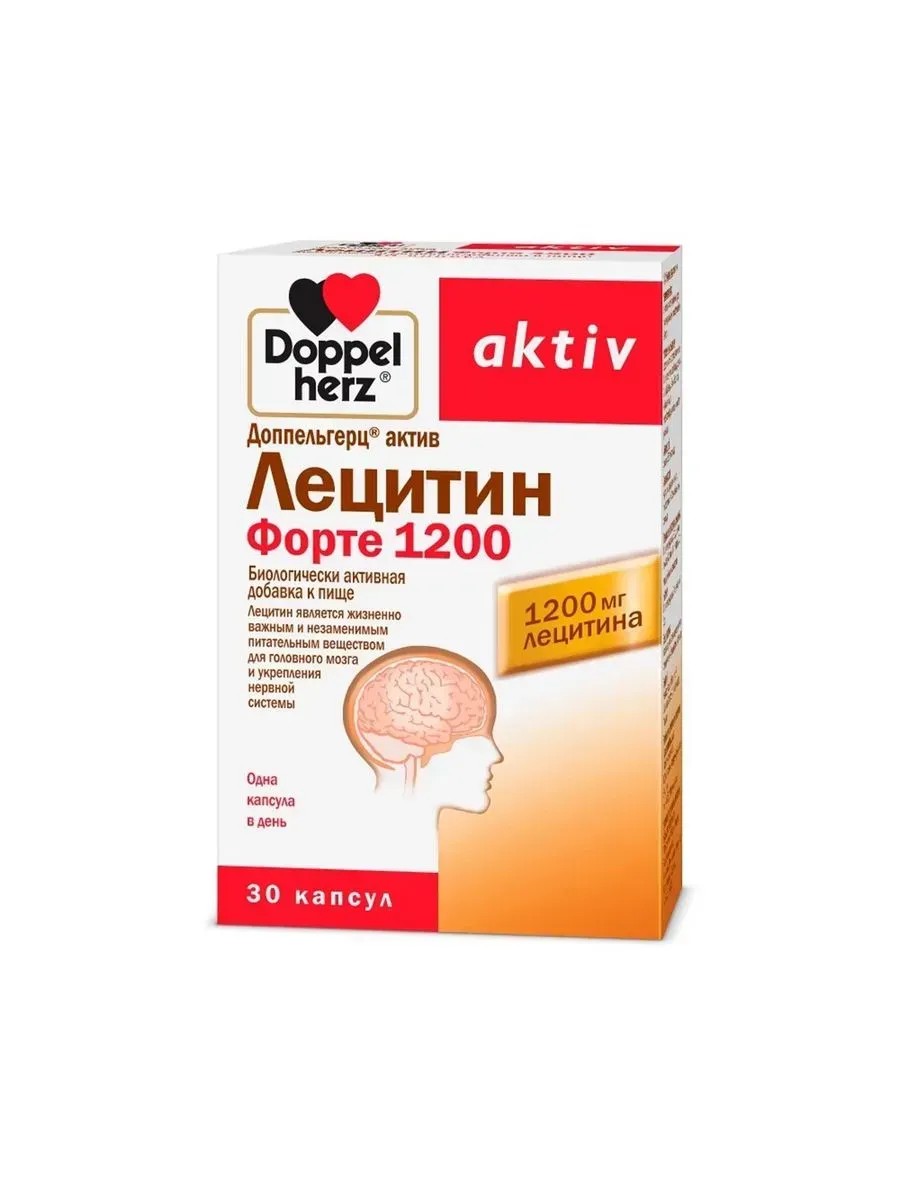 Доппельгерц Актив Лецитин Форте - биологически активная добавка (БАД) к пище в капсулах. Лецитин является жизненно важным и незаменимым питательным веществом для головного мозга и укрепления нервной системы. 1 капсула содержит: лецитин 1200 мг. Лецитин обеспечивает нормальный обмен жиров, способствует улучшению работы мозга, сердечно-сосудистой системы, усвоению витаминов А, D, Е и К, и снижению уровня холестерина в крови. Все клетки организма нуждаются в лецитине, который входит в комплекс витаминов группы В и помогает вырабатывать энергию. Он также необходим для выработки ацетилхолина, обеспечивающего оптимальное функционирование нервной системы. Он необходим для полноценного функционирования нервной системы и мозга.Рекомендуется взрослым по 1 капсуле 1 раз в день во время еды, запивая водой. Продолжительность приема 2 месяца. После перерыва в 1 месяц возможен повторный прием. Перед применением необходимо проконсультироваться с врачом. Упаковка содержит 30 капсул.