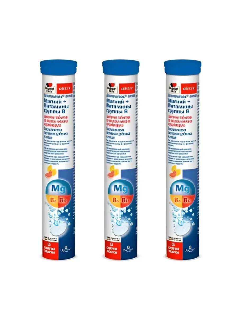 Доппельгерц актив Магний + Витамины группы В - шипучие таблетки со вкусом лимона и грейпфрута.Сбалансированный комплекс, способствующий повышению защитных сил организма. Применяется при повышенных нервных и физических нагрузках, переутомляемости¸ плохом сне и проблем с сердцем.При недостатке в организме магния, витаминов группы В и фолиевой кислоты.Пищевая и энергетическая ценность: 1 шипучая таблетка содержит 45 кДж/10 ккал белки 0 г, жиры 0 г, углеводы 3 г.Указания для больных сахарным диабетом: не содержит хлебных единиц.1 таблетка содержит: Кол-во % от рекомендуемого уровня суточного потребленияМагний 400 мг 100Витамин В6 4,2 мг 210*Витамин В1 1,1 мг 78,5Витамин В2 0,33 мг 21Фолиевая кислота 600 мкг 300*Витамин В12 5,0 мкг 500**- не превышает верхний допустимый уровень потребления