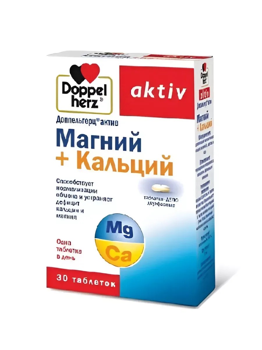 Доппельгерц актив Магний + Кальций таблетки-ДЕПО двухфазныеСпособствует нормализации обмена и устранению дефицита кальция и магнияКальций - является главным элементом костной и зубной ткани, участвует в регуляции проницаемости клеточных мембран, процессе свертывания крови, необходим для поддержания стабильной сердечной деятельности.Кальций участвует в передаче нервных импульсов, сокращении скелетных мышц и мускулатуры миокарда, обмене костной ткани.Способствует выведению солей тяжелых металлов и радионуклидов.В связи с тем, что постоянно происходит выведение кальция из организма, следует в любом возрасте следить за поступлением его с пищей в необходимых количествах или принимать дополнительно.Магний - является важнейшим макроэлементом. Необходим для обеспечения многих энергетических процессов, участвует в обмене белков, жиров, углеводов и нуклеиновых кислот. Принимает участие в обмене фосфора, способствует снижению давления крови, необходим для функционирования многих ферментов.Магний контролирует нормальное функционирование клеток миокарда, способствует регуляции его сократительной функции.Принимает участие в процессе нервно-мышечного возбуждения.В стрессовых ситуациях выводится повышенное количество свободного ионизированного магния, в связи с чем, его дополнительный прием способствует повышению резистентности к стрессу.Должен поступать в организм в определенном соотношении с кальцием.Витамин D3 - управляет усвоением кальция и содействует его интеграции в костный скелет. Он является главным регулятором фосфорно-кальциевого обмена, поддерживает уровень кальция и фосфора в крови, участвует в формировании и возрастном рассасывании костной ткани. У лиц пожилого возраста при дефиците витамина D3 развивается остеопороз костей нижних отделов позвоночника, костей таза и нижних конечностей. Организм, при условии регулярного воздействия солнечного света на кожу, может самостоятельно вырабатывать витамин D3. Однако это воспроизводство витамина не является достаточным для здоровья в наших северных широтах и требуется дополнительное его введение, особенно, в зимнее время года.Марганец - микроэлемент, который необходим для роста, работы половой функции, заживления ран, максимально продуктивной деятельности клеток мозга, а также нормального метаболизма сахаров и инсулина. Марганец - важный антиоксидант, он необходим для синтеза фермента, защищающего организм от свободных радикалов, повреждающих клетки. Марганец укрепляет ткани артерий, делая их более устойчивыми к образованию холестериновых атеросклеротических бляшек. Он также позитивно воздействует на метаболизм холестерина. Необходим для снижения риска заболеваний хрящевой ткани и костной системы.Медь - это минеральное вещество, необходимое для нормальной работы сердца, снижения уровней сахара, холестерина и мочевой кислоты в крови. Помимо этого, она укрепляет костную ткань, способствует развитию клеток крови, укрепляет иммунитет, способствует росту детей. Это минеральное вещество необходимо для выработки коллагена в костной ткани, имеет большое значение для быстрого сращения переломов костей. Медь применяется для снижения риска развития сердечно-сосудистых заболеваний она способствует нормальному ритму сердца.Таблетки - ДЕПО обеспечив