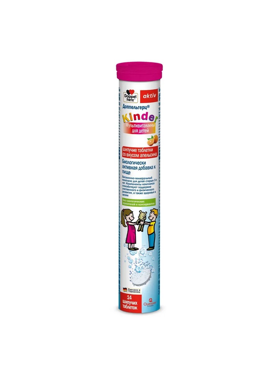 Биологически активная добавка к пище "KinderМультивитамины Доппельгерц" для детей, шипучие таблетки со вкусом апельсина. Витаминно-минеральный комплекс для детей старше 3-х лет. Компоненты комплекса способствуют поддержке умственного и физического развития, а также здоровья в целом. Без синтетических красителей и консервантов. Форма выпуска: шипучие таблетки массой 6800 мг.Упаковка: 14 шипучих таблеток.