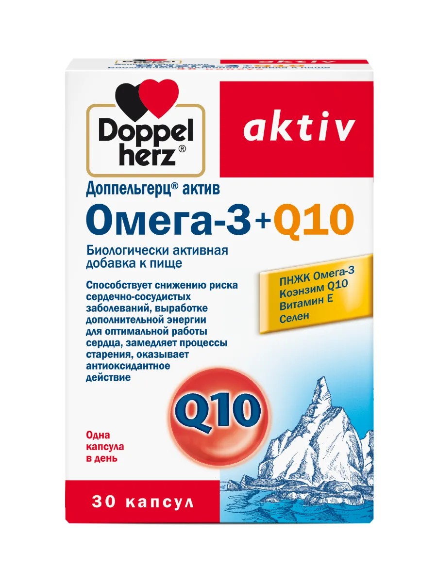 Доппельгерц актив омега-3 + Q10 - это биологически активная добавка (БАД) к пище, содержащая высококачественные жирные кислоты Омега-3 и Коэнзим Q10. Она предназначена для поддержки здоровья сердечно-сосудистой системы, для выработки дополнительной энергии для оптимальной работы сердца; замедляет процессы старения, оказывает антиоксидантное действие.