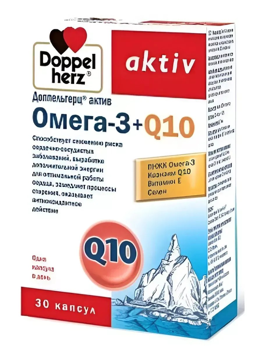 Доппельгерц актив омега-3 + Q10 - это биологически активная добавка (БАД) к пище, содержащая высококачественные жирные кислоты Омега-3 и Коэнзим Q10. Она предназначена для поддержки здоровья сердечно-сосудистой системы, для выработки дополнительной энергии для оптимальной работы сердца; замедляет процессы старения, оказывает антиоксидантное действие.