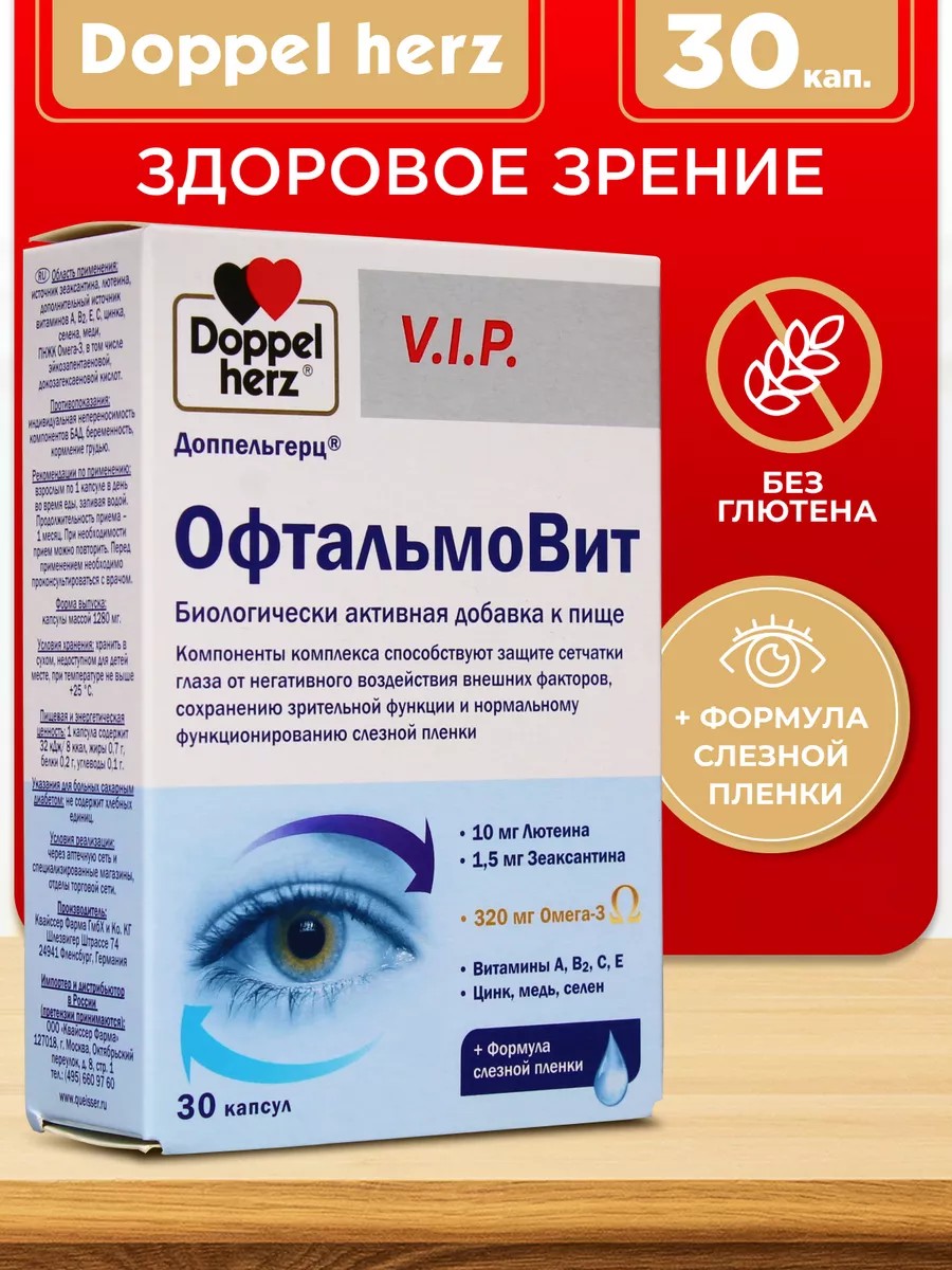 ДОППЕЛЬГЕРЦ VIP ОФТАЛЬМОВИТ - Биологически активная добавка (БАД) к пище - компоненты комплекса способствуют защите сетчатки глаза от негативного воздействия внешних факторов, сохранению зрительной функции и нормальному функционированию слезной пленки