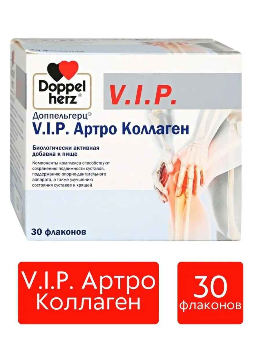 Doppelherz Doppelherz VIP Arthro Collagen. The components of the complex help maintain joint mobility, support the musculoskeletal system, and improve the condition of joints and cartilage. The human musculoskeletal system consists of various parts: joints, cartilage, bones, muscles, and connective tissue. Unilateral load, a sedentary lifestyle, excess weight, and age are aggravating factors. Doppelherz V.I.P. Arthro Collagen offers a balanced combination of vitamins and minerals that help maintain the health of the musculoskeletal system. Collagen hydrolysate is a protein substance that contains a number of amino acids. Collagen is the basis of connective and supporting tissues of the body and also participates in their formation. It is the fiber of bones, cartilage, tendons, and skin and provides their elasticity, strength, and promotes good joint mobility.