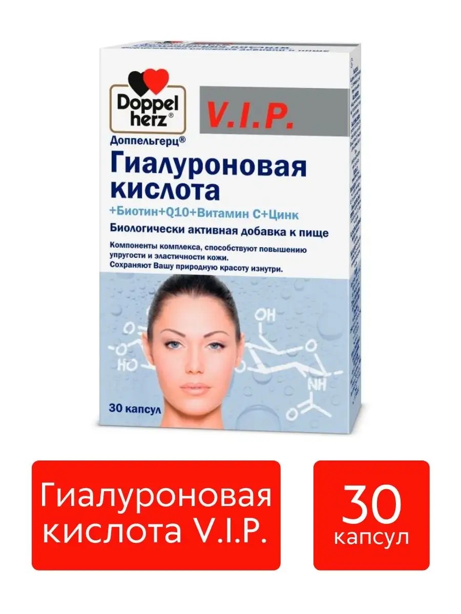 Доппельгерц V.I.P. Гиалуроновая кислота+Биотин+Q10+Витамин С+Цинк, 30 шт