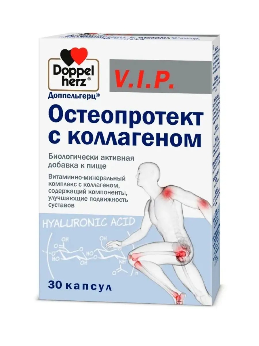 Doppel Herz Doppel Herz Vitamin and mineral complex with collagen, containing components that improve joint mobility. A source of glucosamine, chondroitin, hyaluronic acid, an additional source of vitamins C, E, B12, D, folic acid, magnesium, zinc, copper, selenium, contains manganese. Contraindications: individual intolerance to the components, pregnant and lactating women. Recommended use: Adults take 1 capsule once a day with water during meals. Duration of use: 2 months. After a break of 1 month, repeat administration is possible. Consult a doctor before use. Release form: capsules weighing 1197 mg. Shelf life: 3 years. Storage conditions: store in a dry place at a temperature not exceeding 25C. Keep out of the reach of children! Nutritional and energy value: 1 capsule contains 2 kJ / 1 kcal, proteins 0.1 g, fats 0 g, carbohydrates 0 g. Doppelherz V.I.P. Doppelherz vip