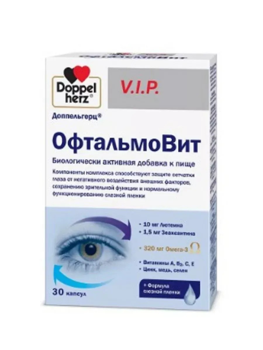 DOPPELHERZ VIP OFTALMOVIT - Biologically active food supplement - the components of the complex help protect the retina from the negative impact of external factors, maintain visual function and normal functioning of the tear film. QUANTITY IN 1 CAPSULE: Vitamin C 120 mg 200*% of the recommended daily intake Vitamin B2 1.4 mg 88% of the recommended daily intake Vitamin A 400 mcg 50% of the recommended daily intake Vitamin E 10 mg 100% of the recommended daily intake Zinc 10 mg 67% of the recommended daily intake Selenium 80 mcg 114*% of the recommended daily intake Copper 750 mcg 75**% of the recommended daily intake Omega-3 PUFAs 320 mg 16 **% of recommended daily intake levelincluding:- eicosapentaenoic acid 190 mg 32**% of the recommended daily intake- docosahexaenoic acid 130 mg 19**% of the recommended daily intakezeaxanthin 1.5 mg* 150**% of the recommended daily intakelutein 10 mg* 200**% of the recommended daily intake* does not exceed the upper tolerable intake level** adequate daily intakeFood and energy value: 1 capsule contains 32 kJ/8 kcal, fats 0.7 g, proteins 0.2 g, carbohydrates 0.1 g.The tear film is a moisturizing and protective layer on the surface of the cornea. It consists of tears and the secretion of the glands of the eyelids, protects the cornea from drying out and external influences, improves the optical properties of the eye. When the composition of the tear film is disrupted, a feeling of discomfort in the eye appears, fatigue during visual strain and eye sensitivity to bright light, wind and other environmental influences increases. Doppelherz VIP OftalmoVit contains lutein, zeaxanthin, as well as vitamins, microelements and Omega-3 PUFAs to maintain optimal functioning of the tear film. The following factors negatively affect vision function: • Increased strain on the eyes (working at a computer, frequently watching TV, driving at night, etc.) • Drafts, dry polluted air (e.g. cigarette smoke) • Ultraviolet radiation (blue light emitted by electronic devices, monitors and energy-saving lamps) • Wearing contact lenses • Unbalanced diet • Age 50+ Vitamins C and E, zinc and selenium are the antioxidant system for eye protection. Increased strain on vision and ultraviolet exposure expose the eyes to constant oxidative stress. To neutralize free radicals, the body must receive optimal amounts of essential antioxidants, such as zinc, selenium, and vitamins C and E. Vitamin B2 is a key regulator of redox processes and is essential for the formation of the mucous membrane of the eye. Vitamin A (retinol) plays a vital role in visual processes and is essential for the formation of mucous membranes, including the conjunctiva. It has the ability to protect the body from the destructive effects of free radicals. Vitamin A plays a key role in light adaptation processes, as it is necessary for the biosynthesis of the light-sensitive pigment of the rod cells of the retina (rhodopsin). Vitamin A is essential for vision as it is the main component of rhodopsin, a protein that absorbs light in the retinal receptors and also supports the function of the conjunctival membranes and cornea. Copper is essential for maintaining the elasticity of blood vessel walls throughout the body. Omega-3 PUFAs are involved in the synthesis of eicosanoids and prostaglandins. Taking omega-3 PUFAs helps reduce the risk of age-related macular degeneration. Omega-3 PUFAs can improve tear film characteristics. There is evidence that taking omega-3 PUFAs reduces dry eye and increases tear production. Lutein, a carotenoid, is the main phytochemical that protects the eyes from photodamage. The carotenoids lutein and zeaxanthin, found in the lens and retina, protect photoreceptor cells from oxygen radicals. Zeaxanthin is a carotenoid that protects the eyes from photodamage. Zeaxanthin, along with lutein, are the most active antioxidant compounds in the eyes. Only zeaxanthin and lutein are found in the retina, where they account for up to 70% of the total eye concentration.