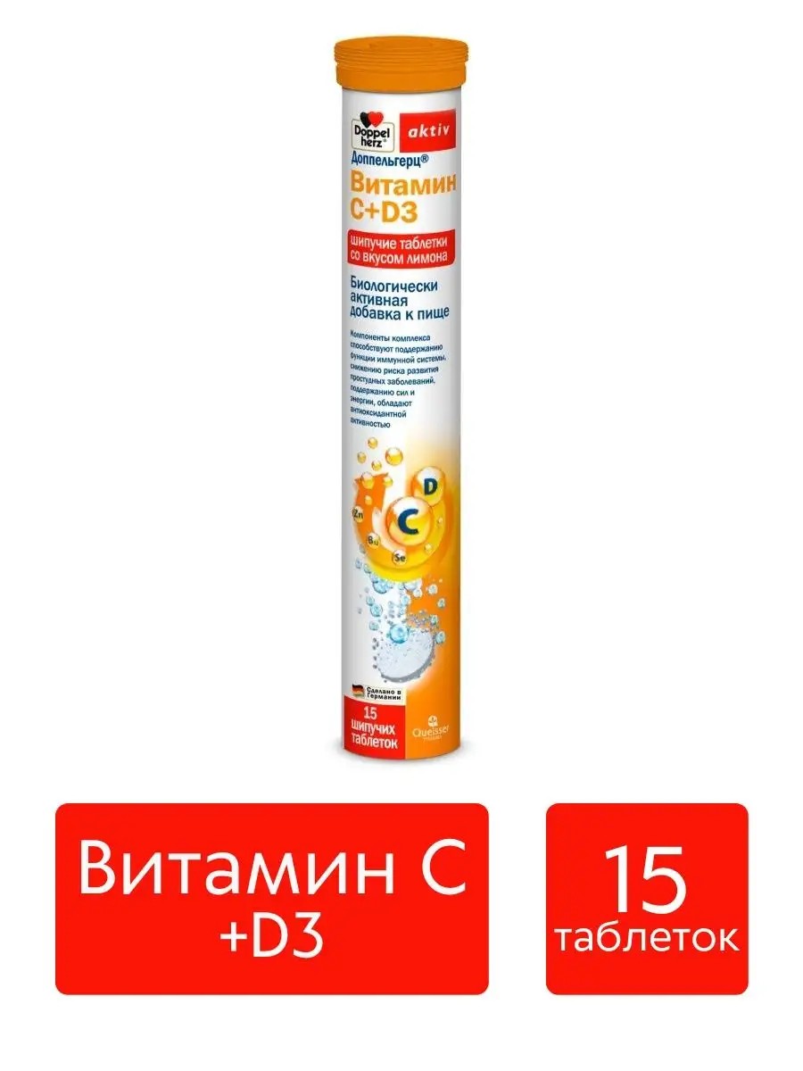 Doppel herz Doppel herz The components of the complex help maintain the function of the immune system, reduce the risk of developing colds, maintain strength and energy, and also have antioxidant activity. 1 effervescent tablet contains: Vitamin C 700 mg % of the recommended daily intake 1167* Vitamin B12 7.5 mcg % of the recommended daily intake 750* Vitamin D3 12 mcg (480 IU) % of the recommended daily intake 240* Zinc 10 mg % of the recommended daily intake 67 Selenium 55 mcg % of the recommended daily intake 79 * does not exceed the upper tolerable intake level. Nutritional value: 1 effervescent tablet contains: fat 0 g, protein 0 g, carbohydrates 3 g. Energy value: 1 effervescent tablet contains 51 kJ / 12 kcal. Instructions for diabetics: does not contain bread units. Indications: as a biologically active food supplement - an additional source of vitamins C, B12, D3 (480 IU in 1 tablet), zinc, selenium. Contraindications: individual intolerance to the components of the dietary supplement, pregnancy, breastfeeding. Directions for use: Adults take 1 tablet daily during meals, dissolve the tablet in a glass of water (200 ml). Duration of treatment: 15-30 days. If necessary, the dose can be repeated. Before use, consult a doctor. Doppelherz aktiv Vitamin C + D3, 15 effervescent tablets with lemon flavor