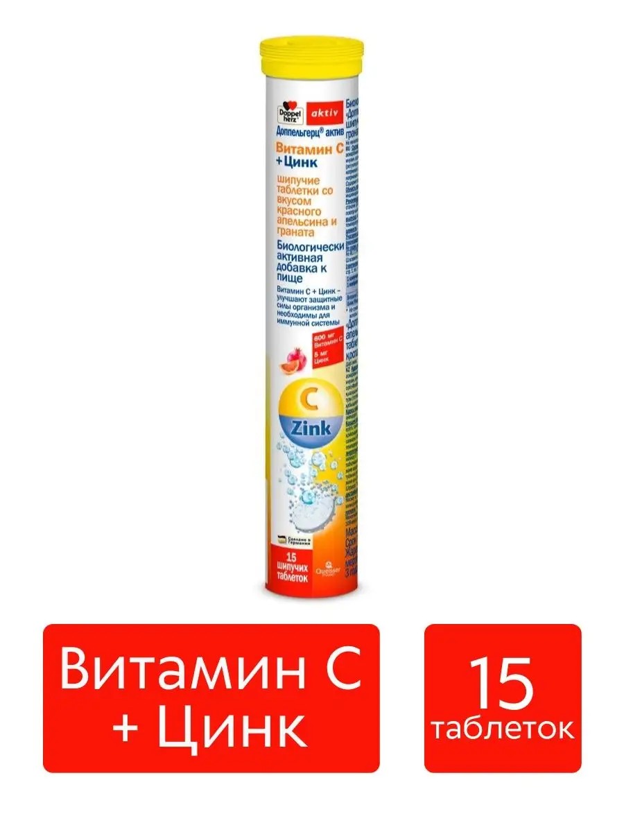 Доппель герц Doppel herz Витаминный препарат Доппельгерц Актив шипучий витамин С + цинк предназначен для восполнения дефицита соответствующих витаминов и элементов в организме человека. Эти биологически активные добавки имеют ярко выраженные антиоксидантные свойства и помогают в предохранении клеточных мембран. Также препарат Доппельгерц полезен для укрепления и стимуляции роста волос, повышения иммунитета и обладает противовоспалительным эффектом.Доппельгерц Актив шипучие таблетки, которые легко растворяются в воде. Они имеют приятный свежий вкус и запах граната в сочетании с апельсином, что делает препарат удобным в применении.Состав: витамин С, цинк, цикламат натрия, вкусовые добавки, вспомогательные вещества.Способ применения: взрослым и особам не моложе 14 лет следует принимать одну таблетку Доппельгерц Актив шипучий, предварительно бросив ее в 200 мл воды. Рекомендованная длительность курса - 2 месяца. Минимальная пауза между курсами - 1 месяц. Доппельгерц актив Doppelherz aktiv Витамин С + Цинк